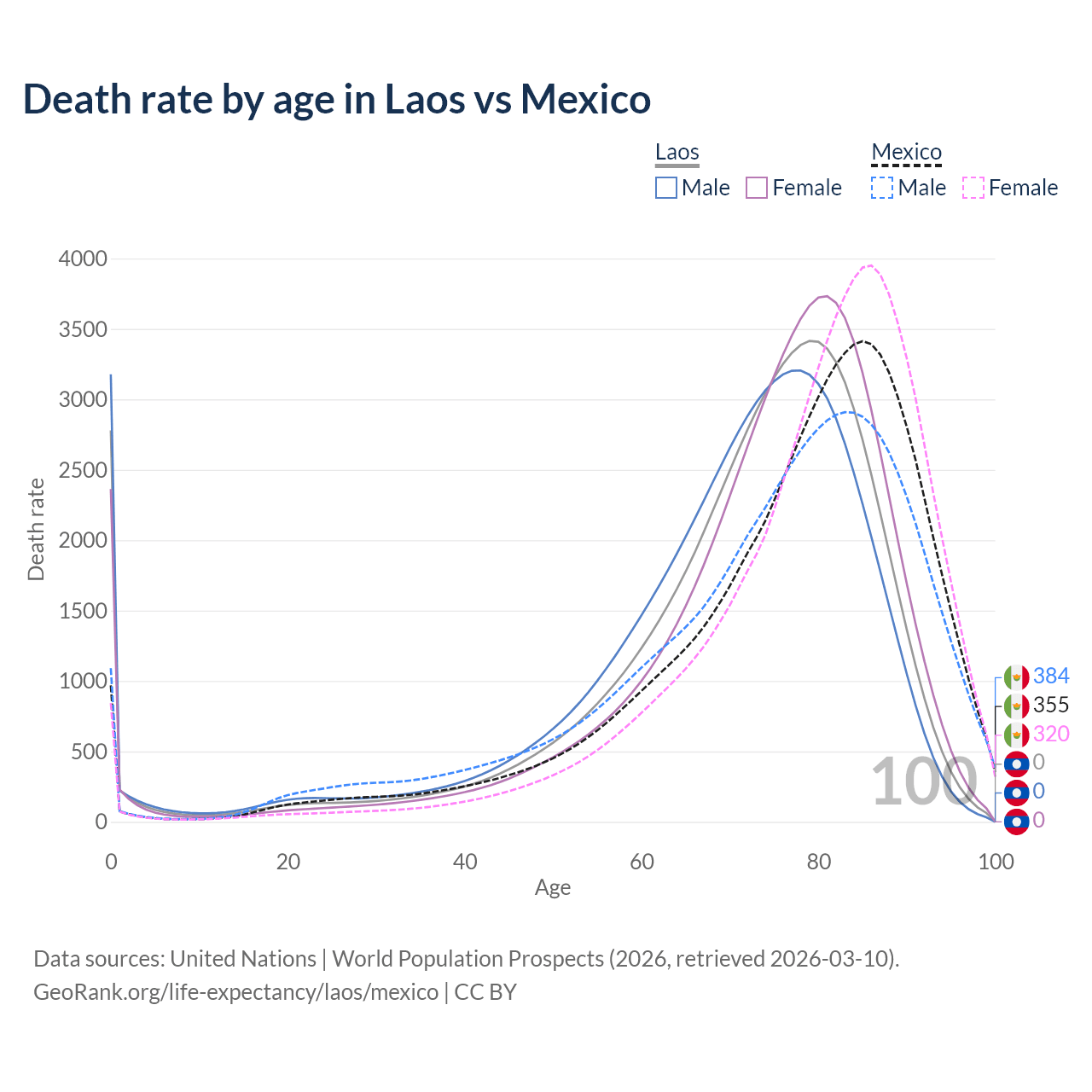 In Laos, the most common age of death is 79, compared to 85 in Mexico. The median age of death is 74.7 in Laos and 80.1 in Mexico, meaning only half of each cohort is expected to live past that age.