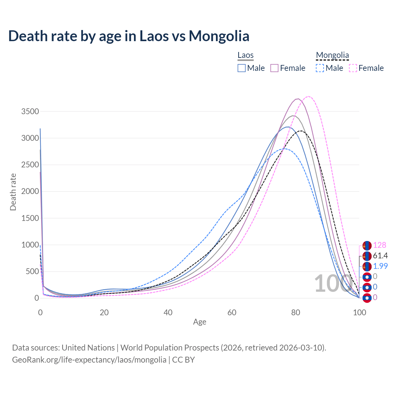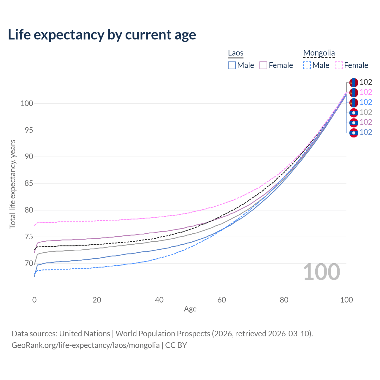 This life expectancy calculator shows the odds of living to 100, 95, 90, and below based on current age for both males and females in Laos and Mongolia, along with mean and median age of death. The calculations are based on the 2026 life tables (actuarial tables) from the UN World Population Prospects.