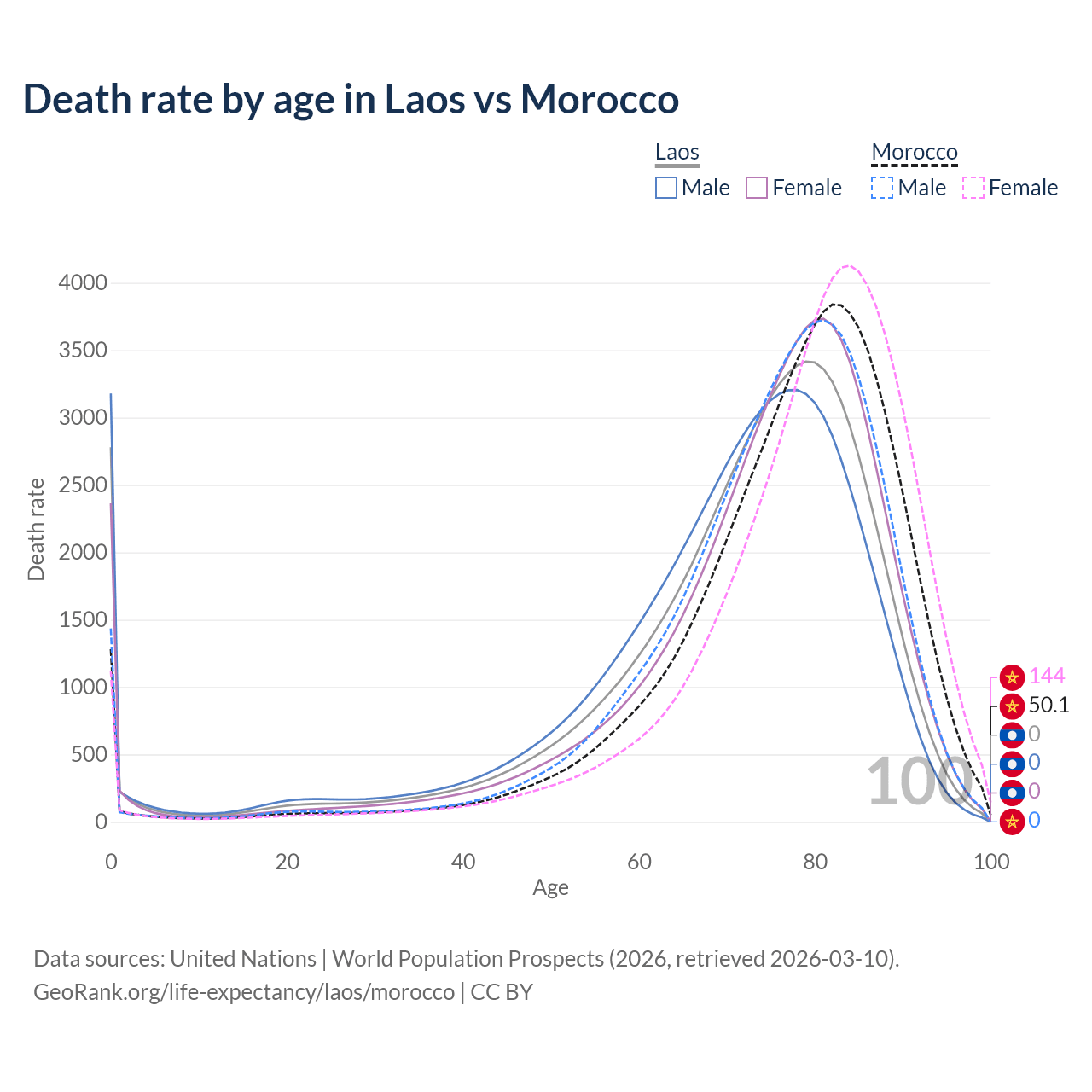In Laos, the most common age of death is 79, compared to 82 in Morocco. The median age of death is 74.7 in Laos and 79.3 in Morocco, meaning only half of each cohort is expected to live past that age.