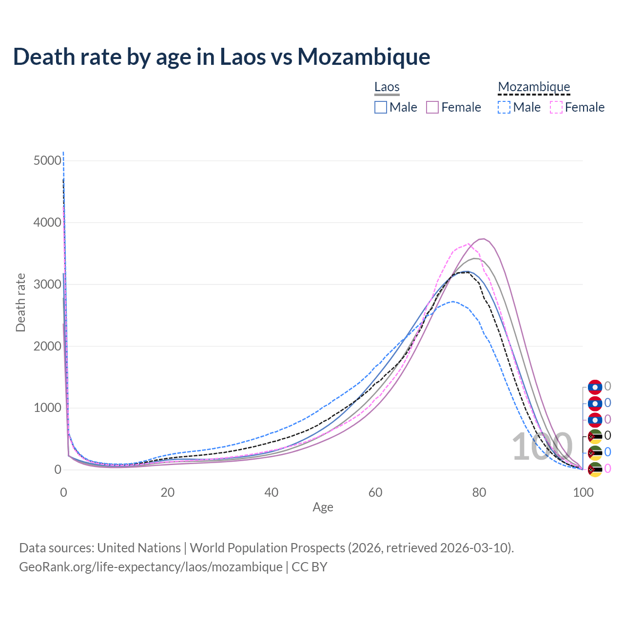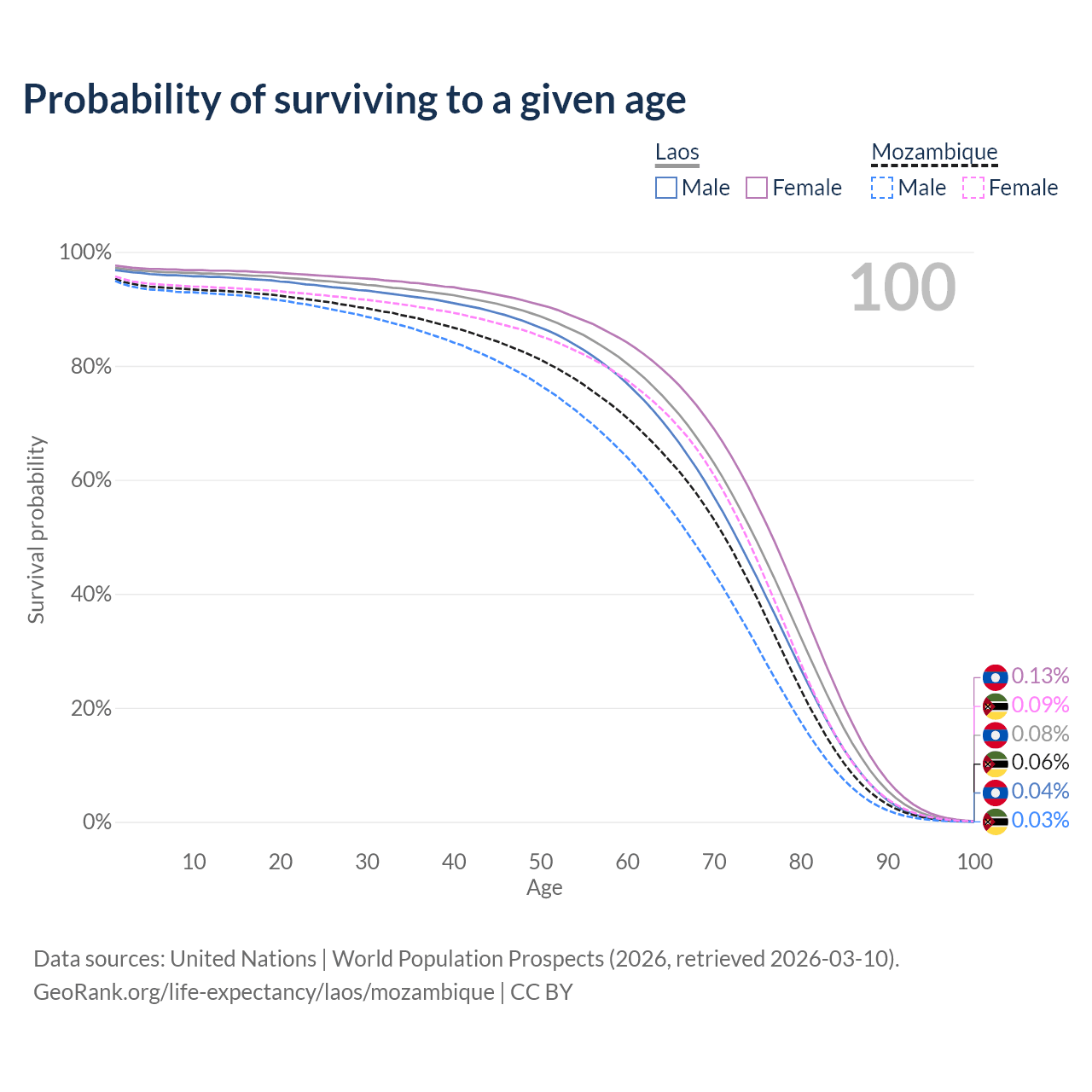 This life expectancy calculator shows the odds of living to 100, 95, 90, and below based on current age for both males and females in Laos and Mozambique, along with mean and median age of death. The calculations are based on the 2026 life tables (actuarial tables) from the UN World Population Prospects.