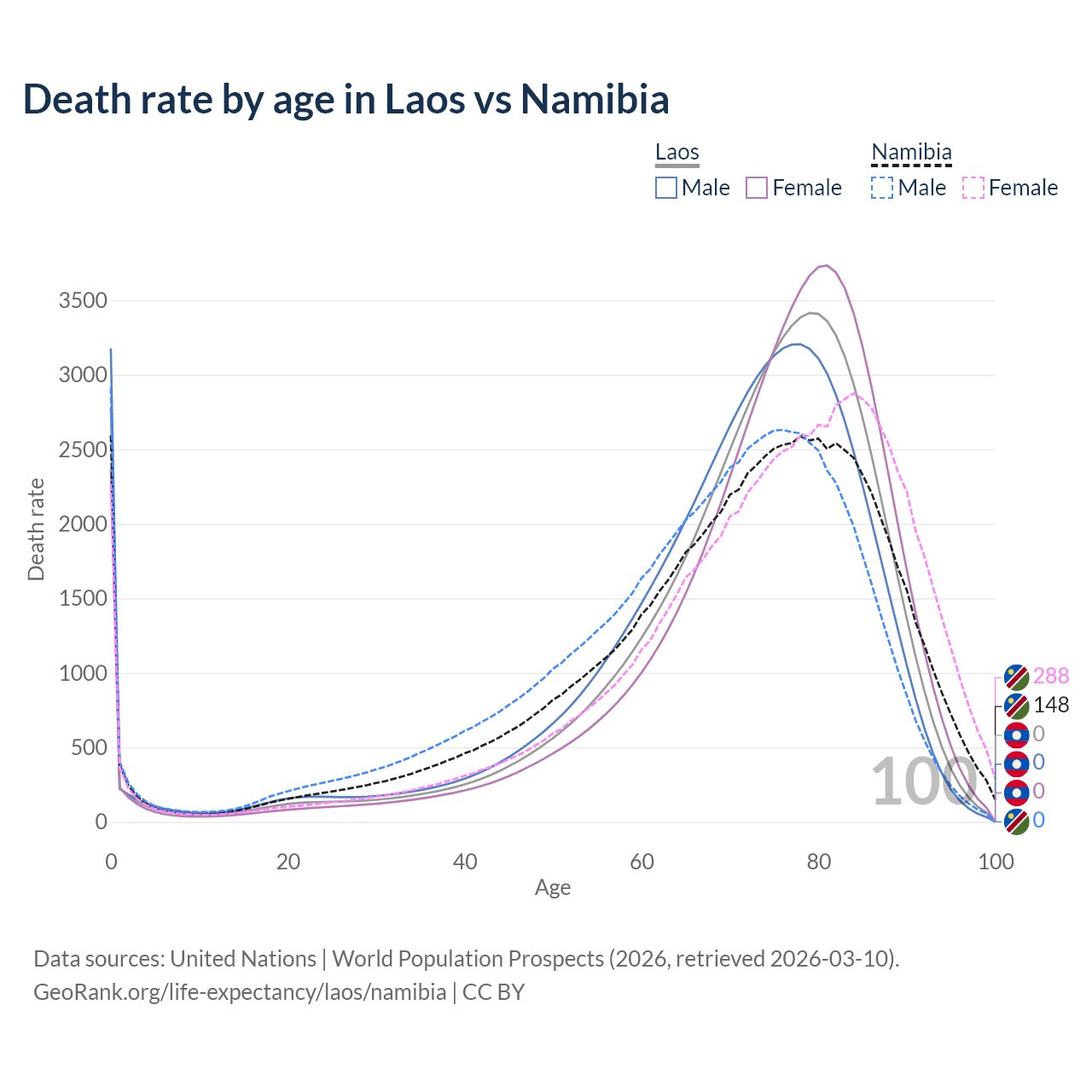 In Laos, the most common age of death is 79, compared to 0 in Namibia. The median age of death is 74.7 in Laos and 72.7 in Namibia, meaning only half of each cohort is expected to live past that age.