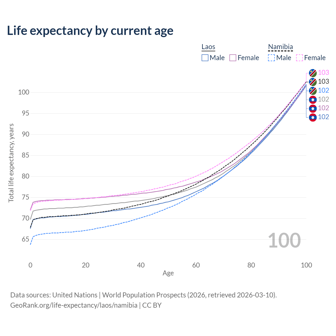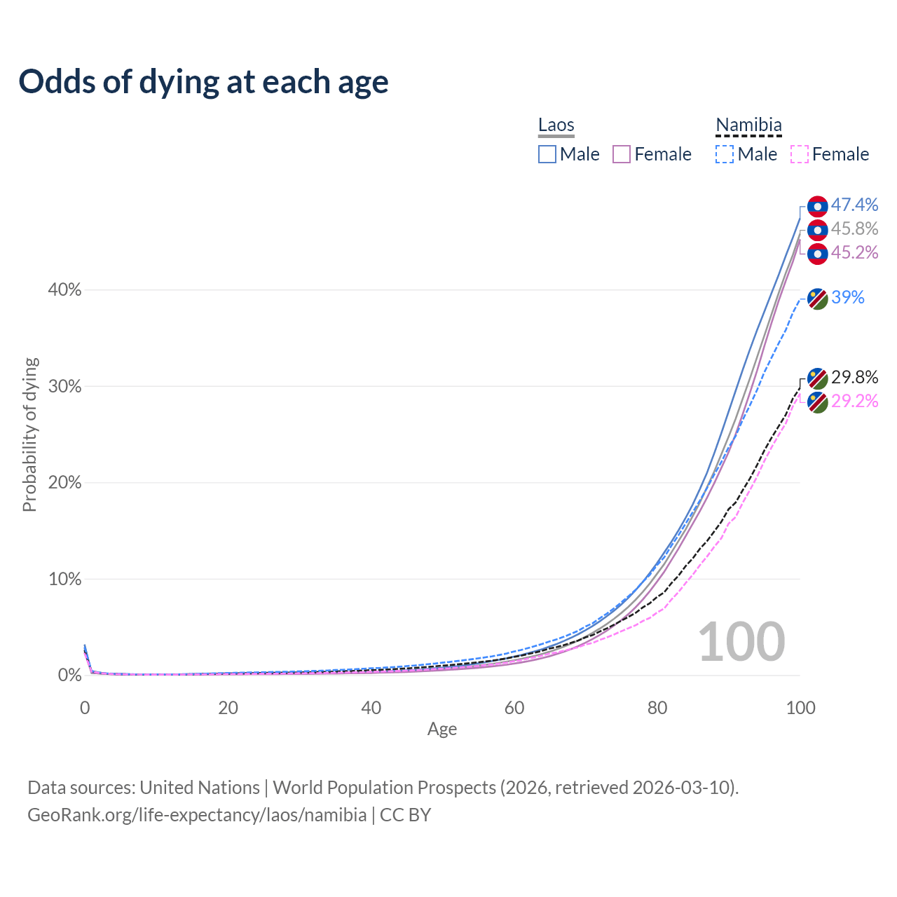 This life expectancy calculator shows the odds of living to 100, 95, 90, and below based on current age for both males and females in Laos and Namibia, along with mean and median age of death. The calculations are based on the 2026 life tables (actuarial tables) from the UN World Population Prospects.