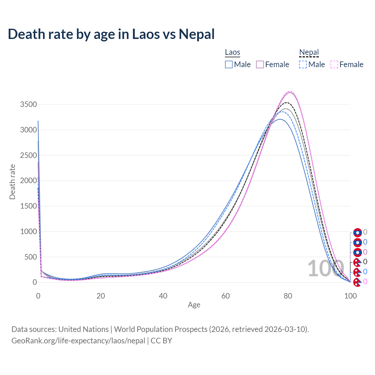 In Laos, the most common age of death is 79, compared to 80 in Nepal. The median age of death is 74.7 in Laos and 75.4 in Nepal, meaning only half of each cohort is expected to live past that age.