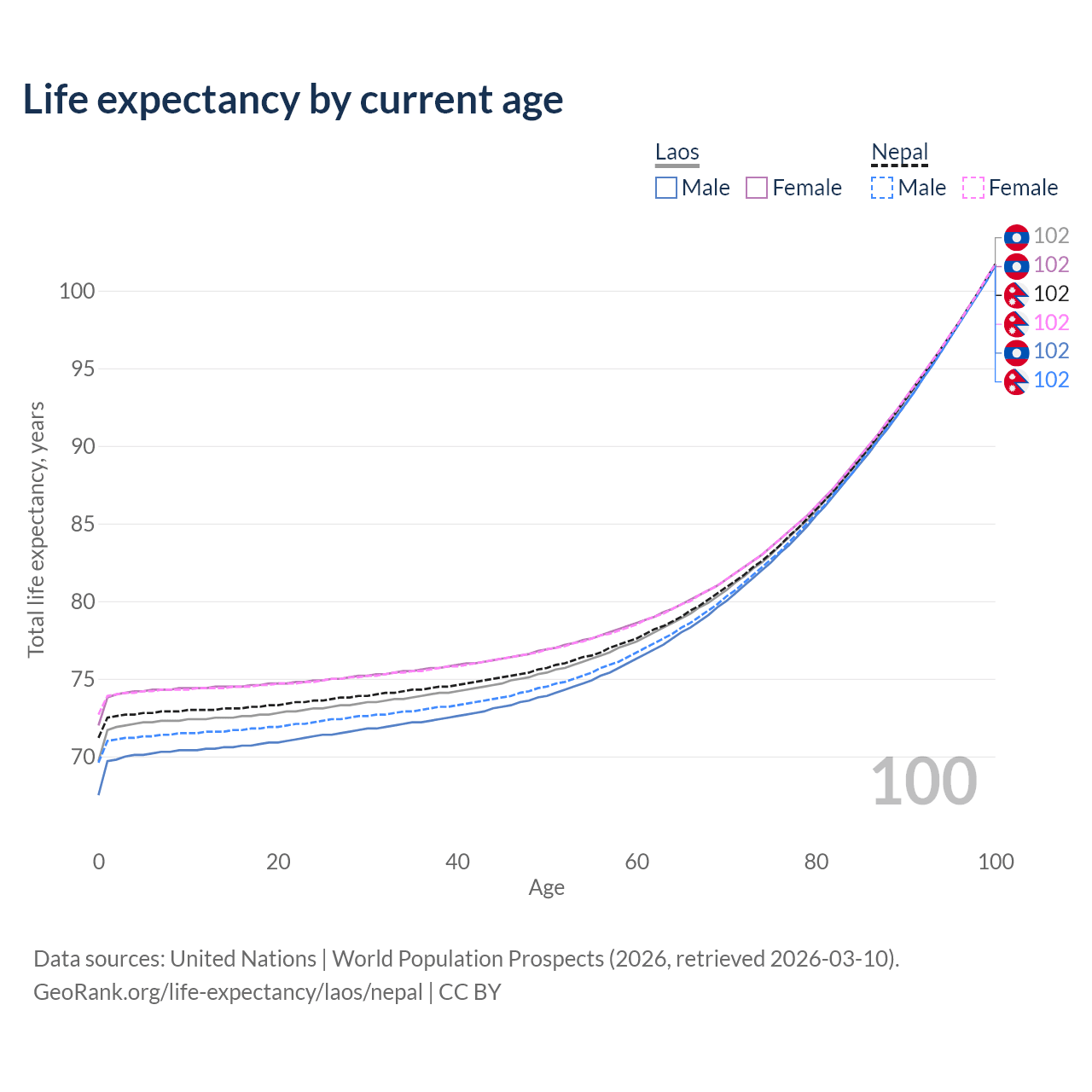 This life expectancy calculator shows the odds of living to 100, 95, 90, and below based on current age for both males and females in Laos and Nepal, along with mean and median age of death. The calculations are based on the 2026 life tables (actuarial tables) from the UN World Population Prospects.