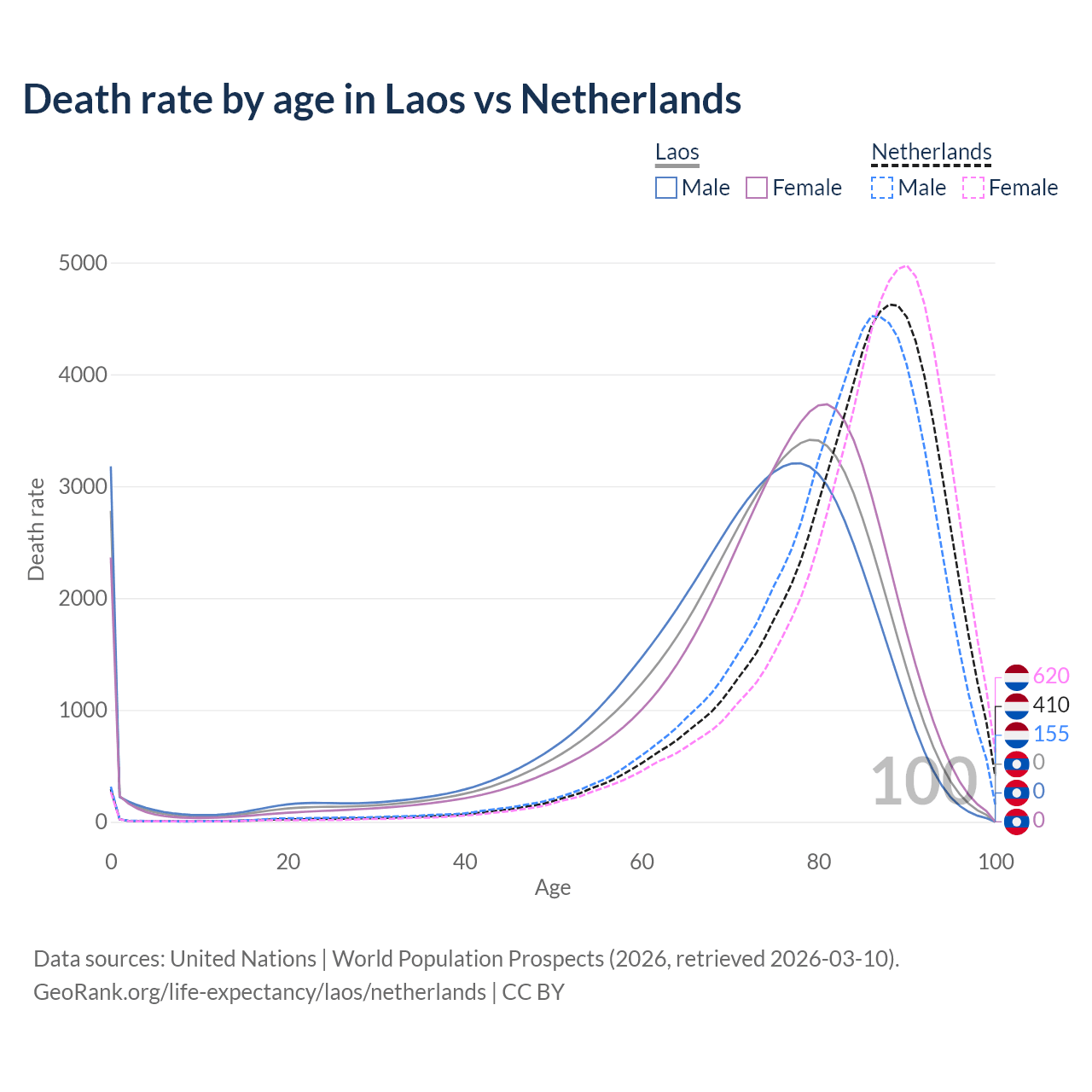 In Laos, the most common age of death is 79, compared to 88 in the Netherlands. The median age of death is 74.7 in Laos and 85.5 in the Netherlands, meaning only half of each cohort is expected to live past that age.