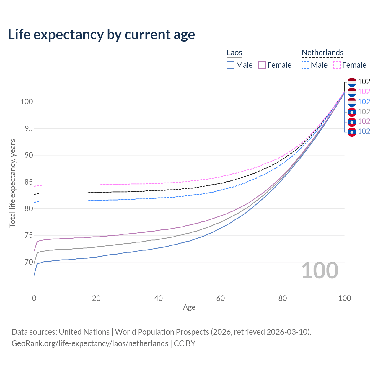 This life expectancy calculator shows the odds of living to 100, 95, 90, and below based on current age for both males and females in Laos and the Netherlands, along with mean and median age of death. The calculations are based on the 2026 life tables (actuarial tables) from the UN World Population Prospects.