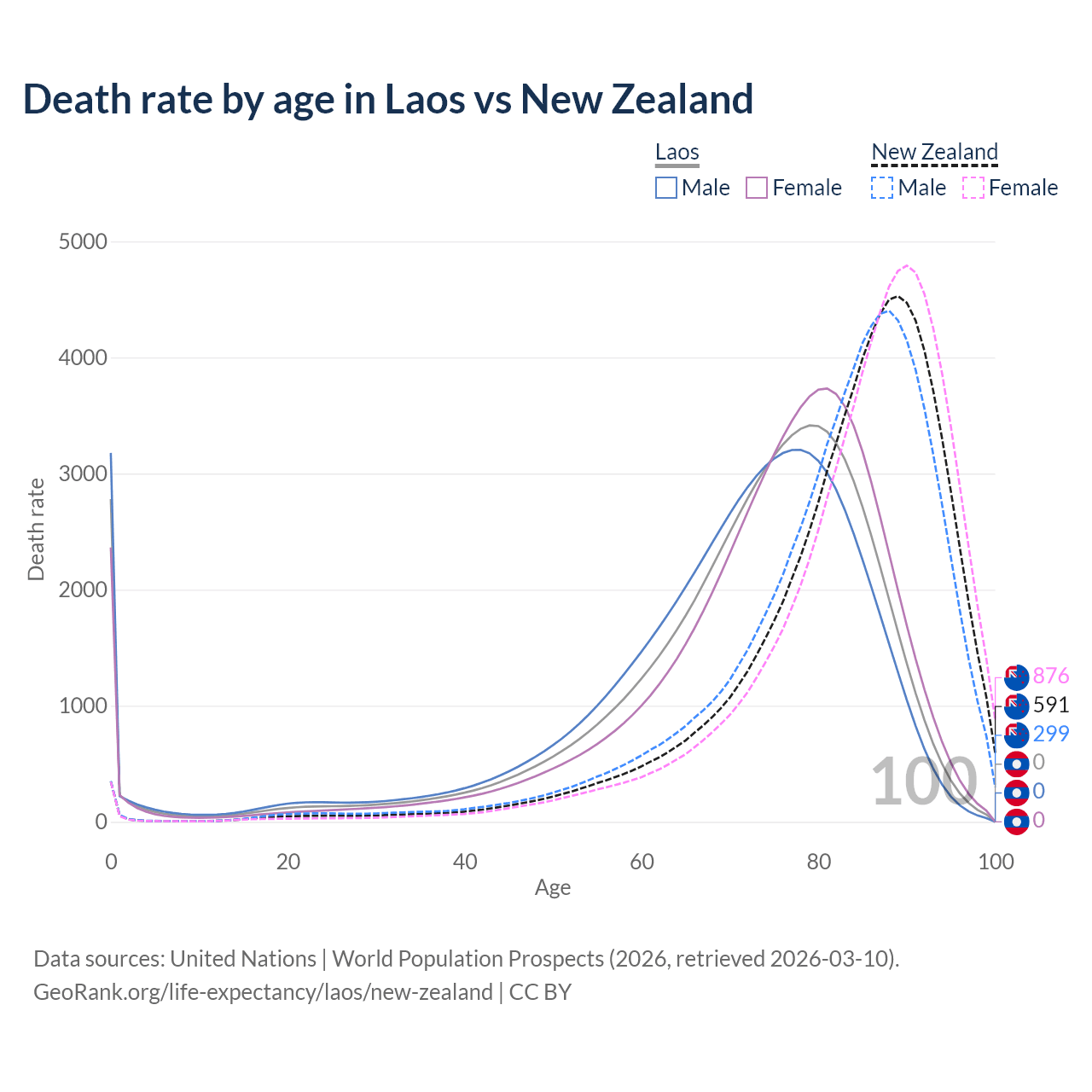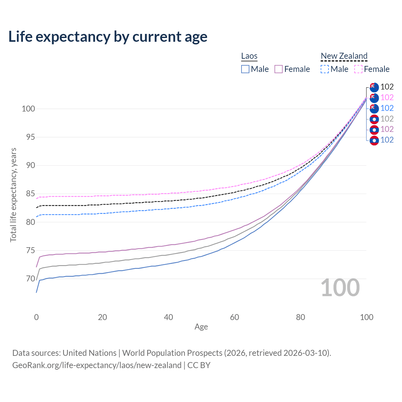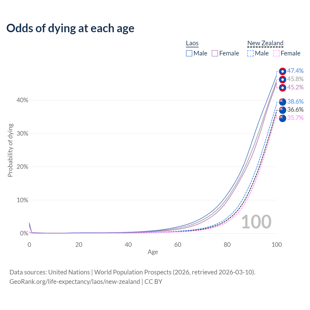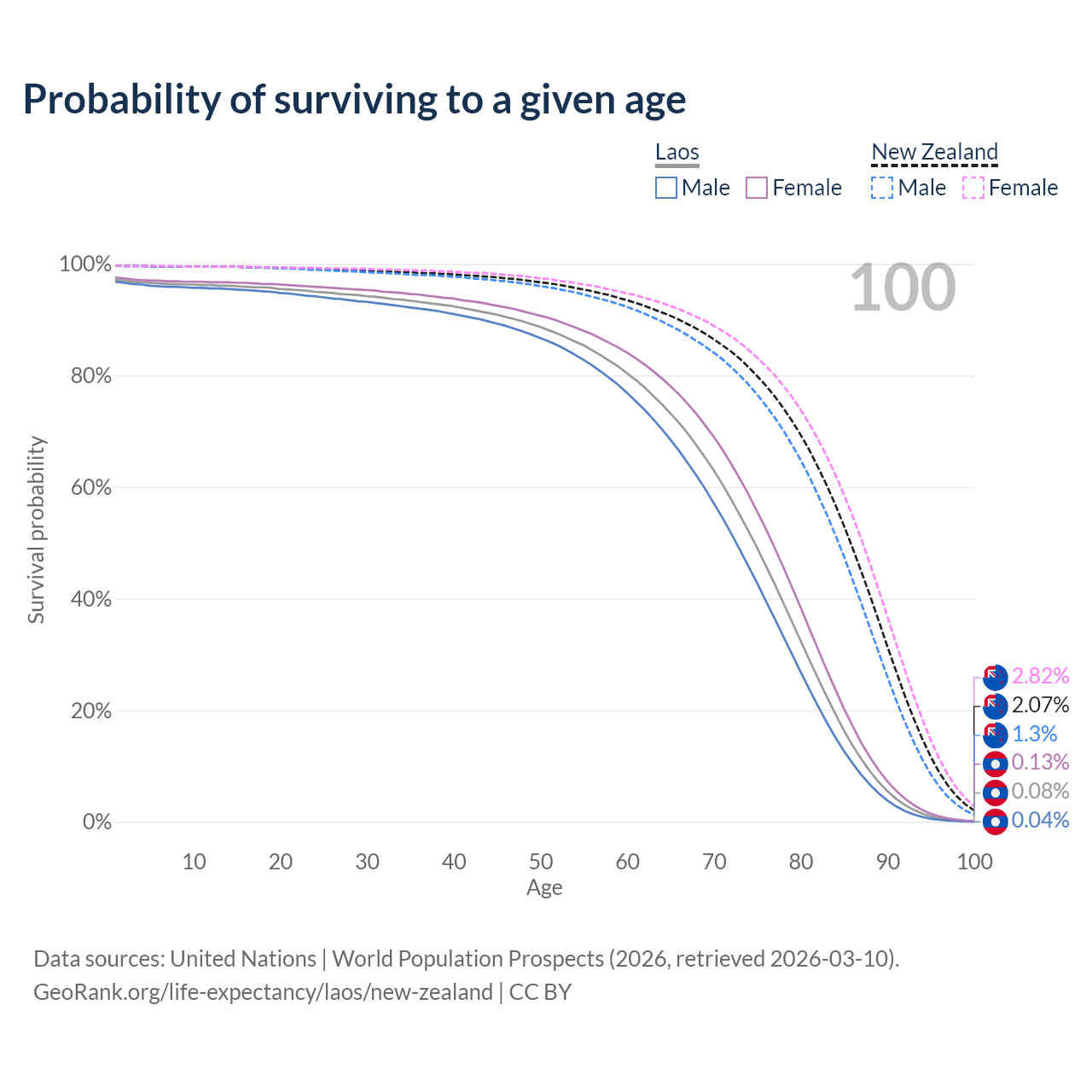 This life expectancy calculator shows the odds of living to 100, 95, 90, and below based on current age for both males and females in Laos and New Zealand, along with mean and median age of death. The calculations are based on the 2026 life tables (actuarial tables) from the UN World Population Prospects.