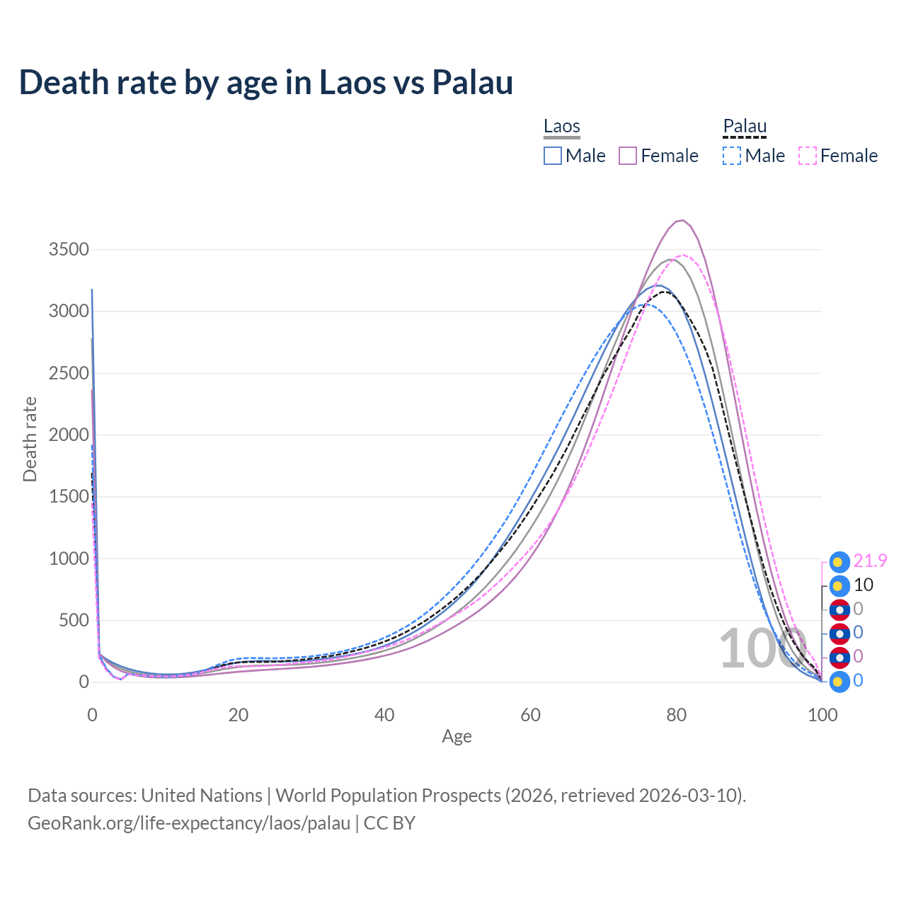 In Laos, the most common age of death is 79, compared to 78 in Palau. The median age of death is 74.7 in Laos and 73.8 in Palau, meaning only half of each cohort is expected to live past that age.