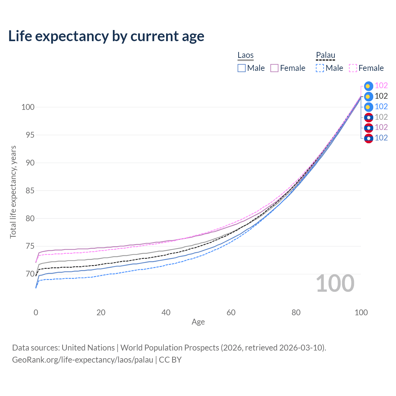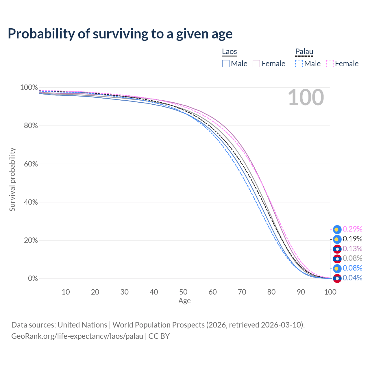 This life expectancy calculator shows the odds of living to 100, 95, 90, and below based on current age for both males and females in Laos and Palau, along with mean and median age of death. The calculations are based on the 2026 life tables (actuarial tables) from the UN World Population Prospects.