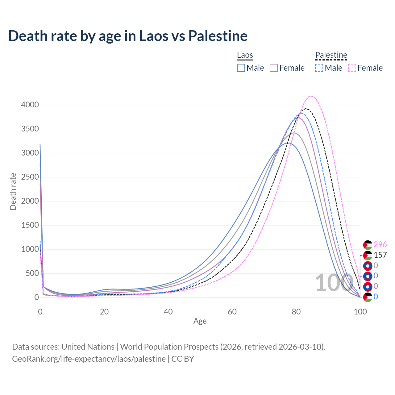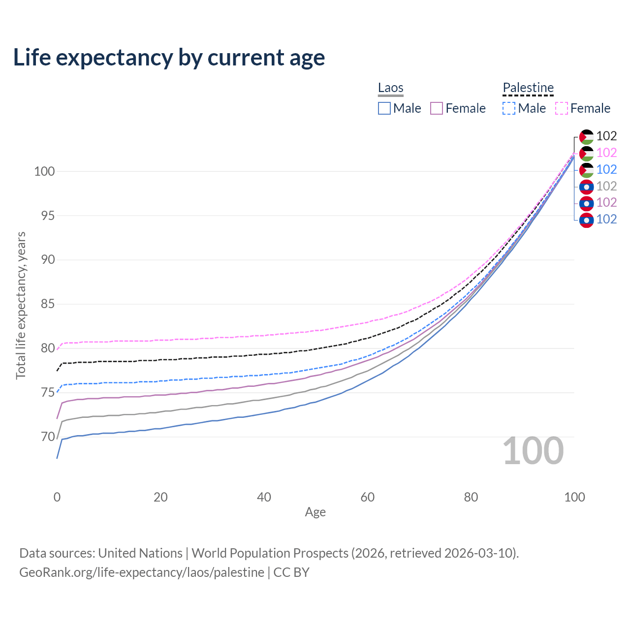 This life expectancy calculator shows the odds of living to 100, 95, 90, and below based on current age for both males and females in Laos and Palestine, along with mean and median age of death. The calculations are based on the 2026 life tables (actuarial tables) from the UN World Population Prospects.