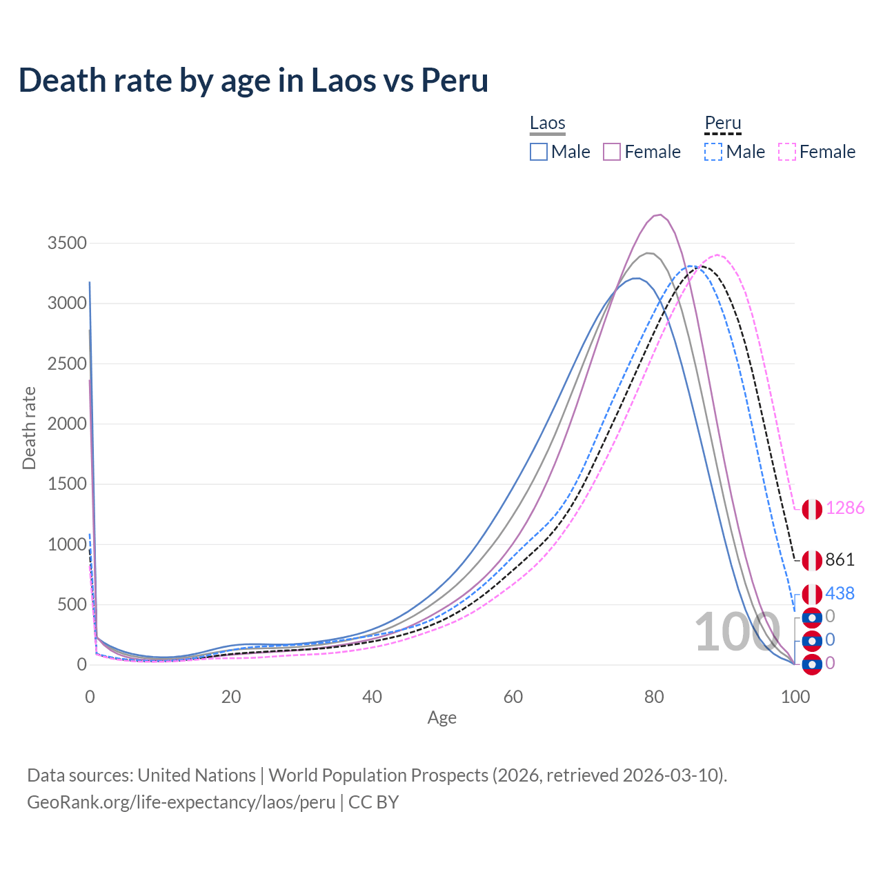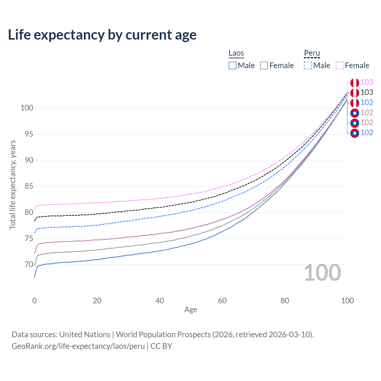 This life expectancy calculator shows the odds of living to 100, 95, 90, and below based on current age for both males and females in Laos and Peru, along with mean and median age of death. The calculations are based on the 2026 life tables (actuarial tables) from the UN World Population Prospects.