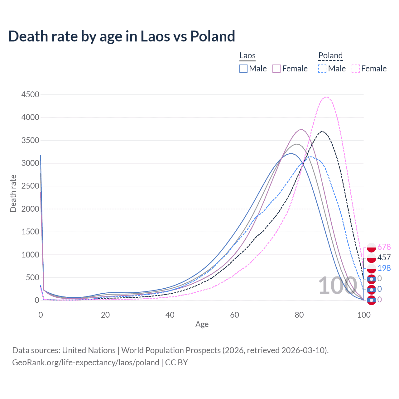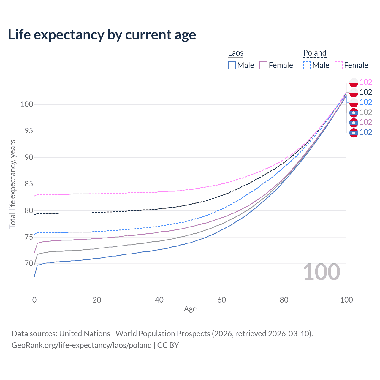 This life expectancy calculator shows the odds of living to 100, 95, 90, and below based on current age for both males and females in Laos and Poland, along with mean and median age of death. The calculations are based on the 2026 life tables (actuarial tables) from the UN World Population Prospects.