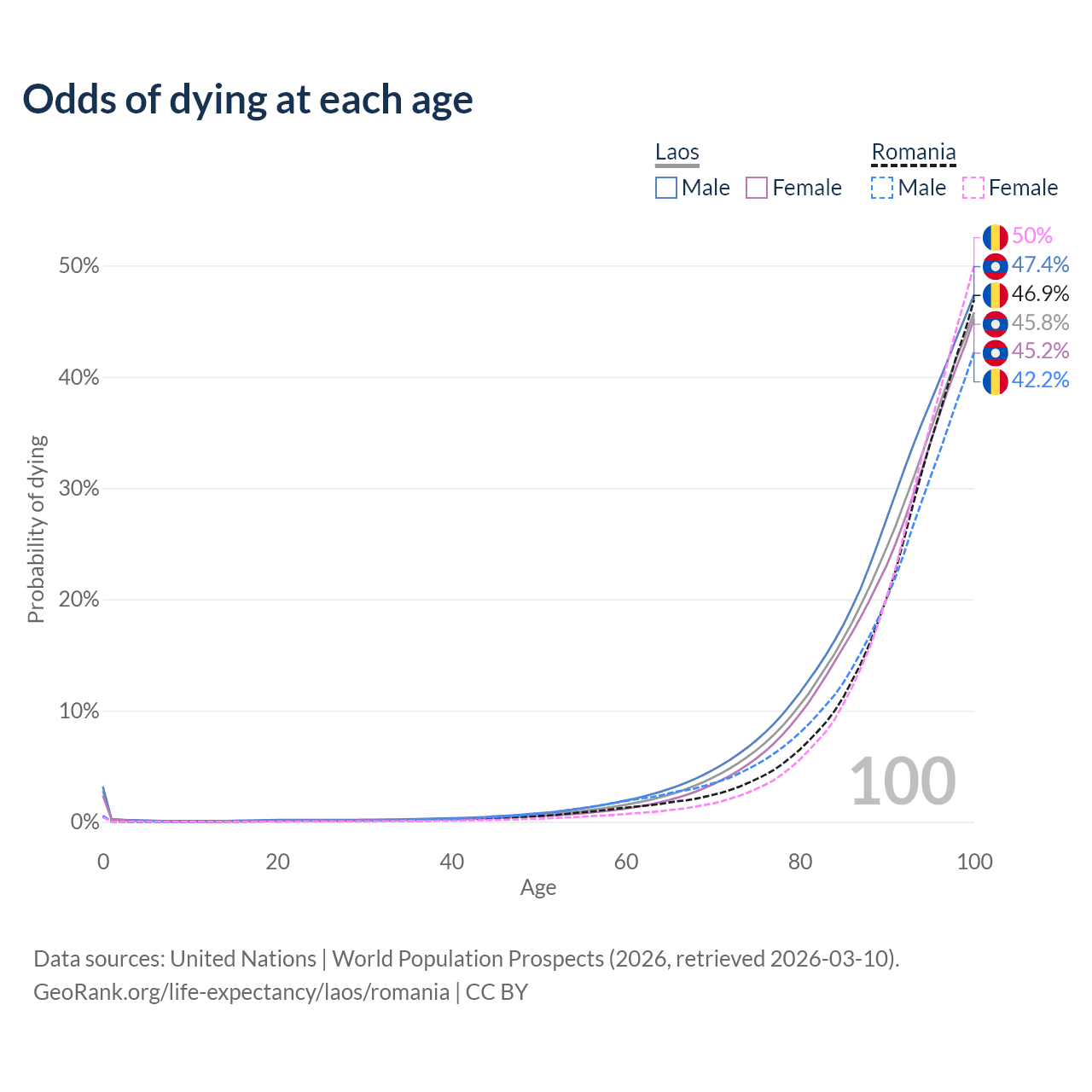 This life expectancy calculator shows the odds of living to 100, 95, 90, and below based on current age for both males and females in Laos and Romania, along with mean and median age of death. The calculations are based on the 2026 life tables (actuarial tables) from the UN World Population Prospects.