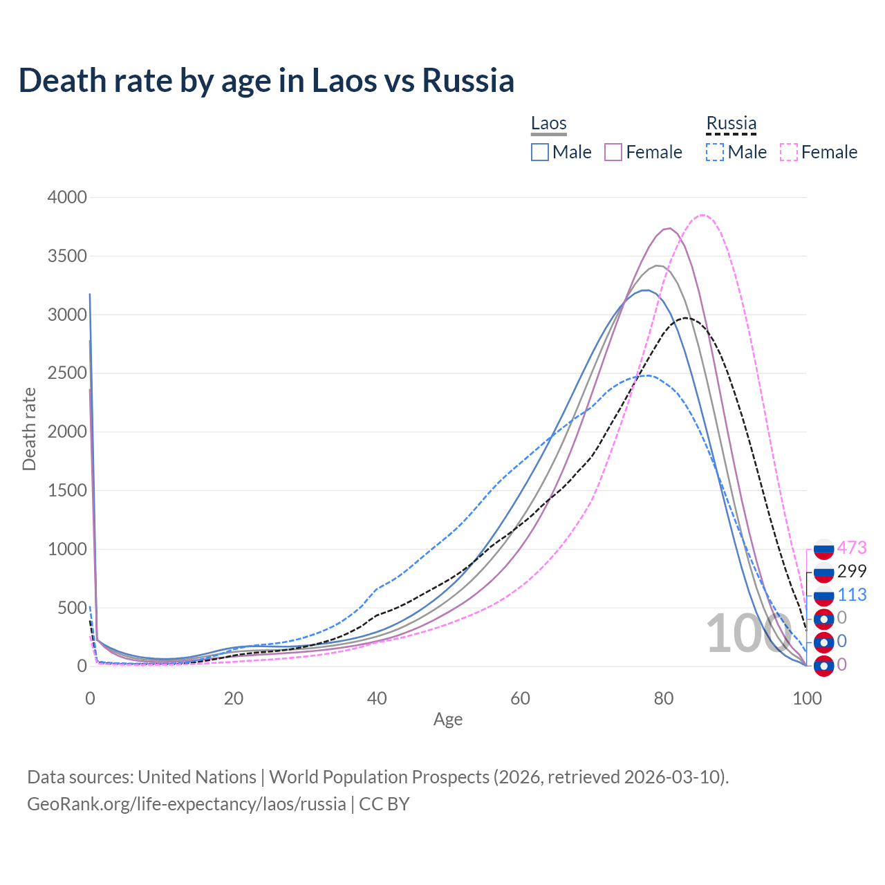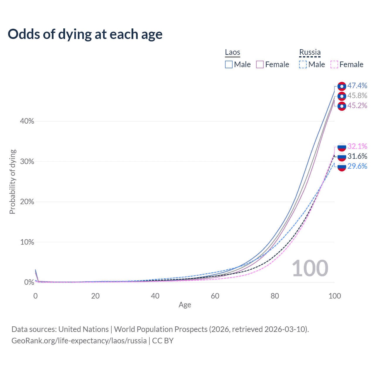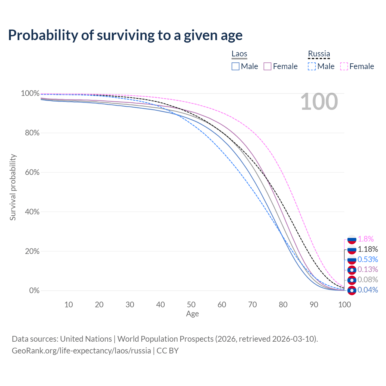 This life expectancy calculator shows the odds of living to 100, 95, 90, and below based on current age for both males and females in Laos and Russia, along with mean and median age of death. The calculations are based on the 2026 life tables (actuarial tables) from the UN World Population Prospects.