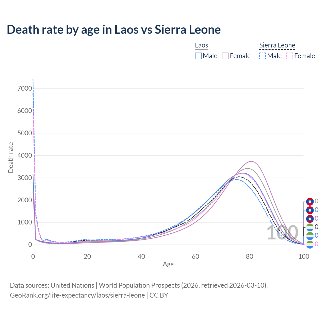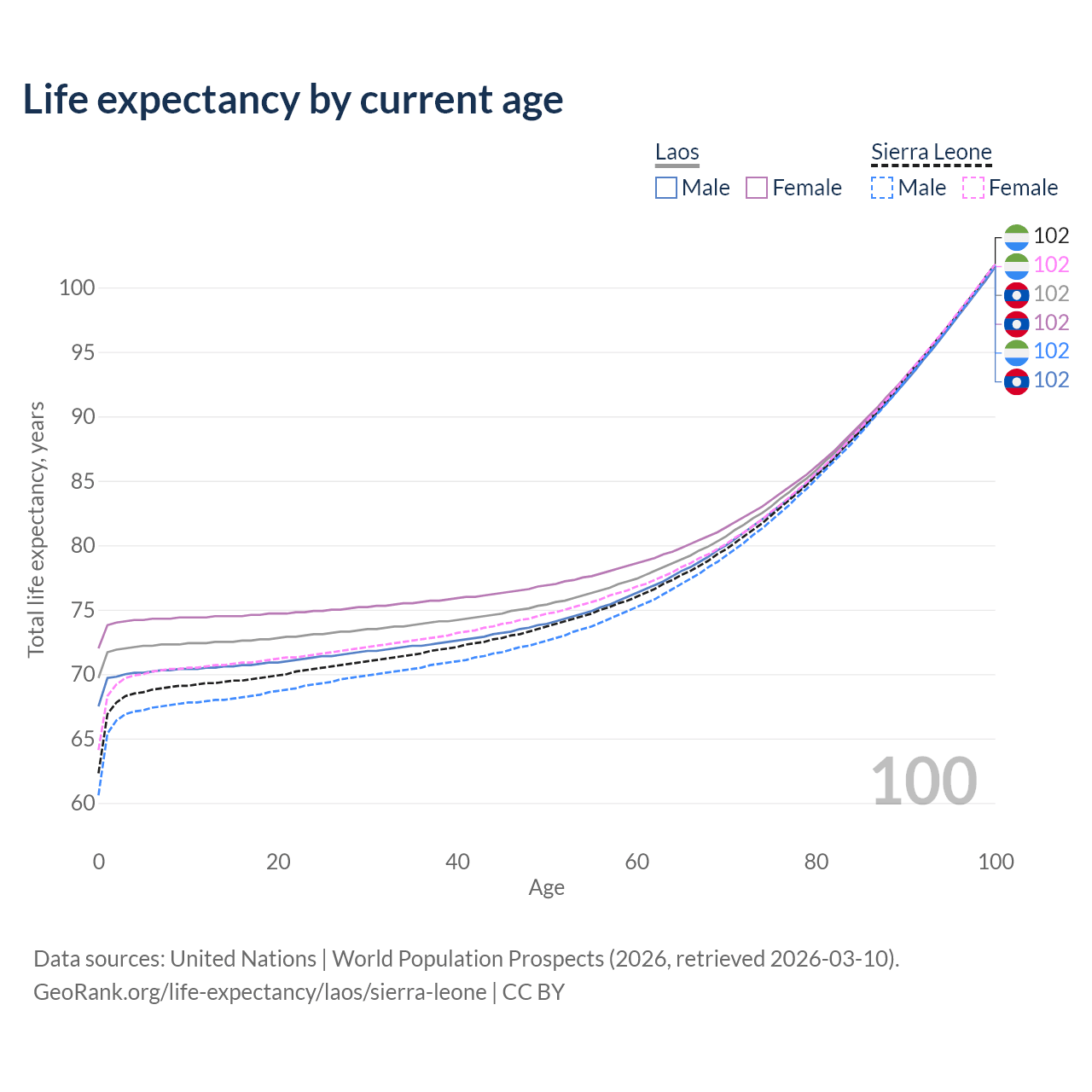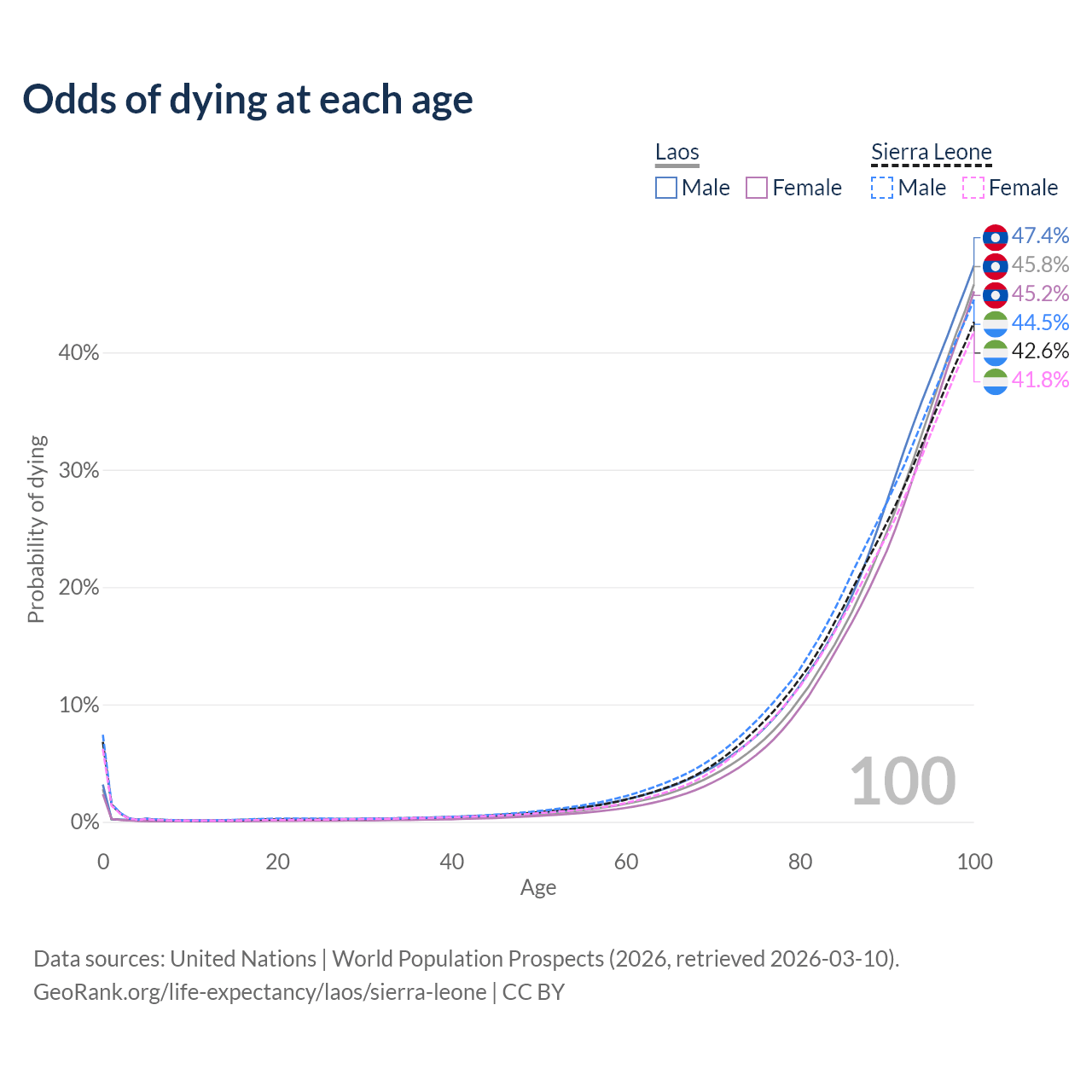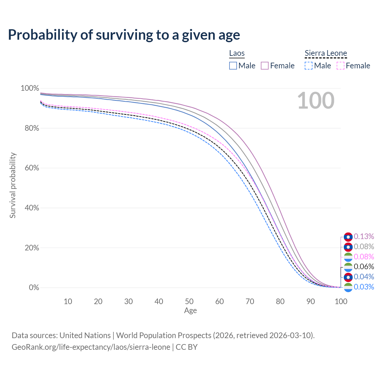 This life expectancy calculator shows the odds of living to 100, 95, 90, and below based on current age for both males and females in Laos and Sierra Leone, along with mean and median age of death. The calculations are based on the 2026 life tables (actuarial tables) from the UN World Population Prospects.