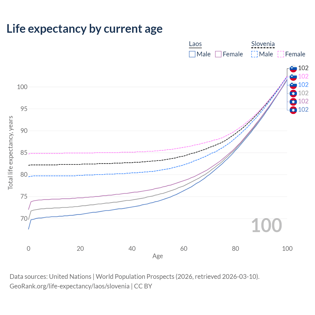 This life expectancy calculator shows the odds of living to 100, 95, 90, and below based on current age for both males and females in Laos and Slovenia, along with mean and median age of death. The calculations are based on the 2026 life tables (actuarial tables) from the UN World Population Prospects.