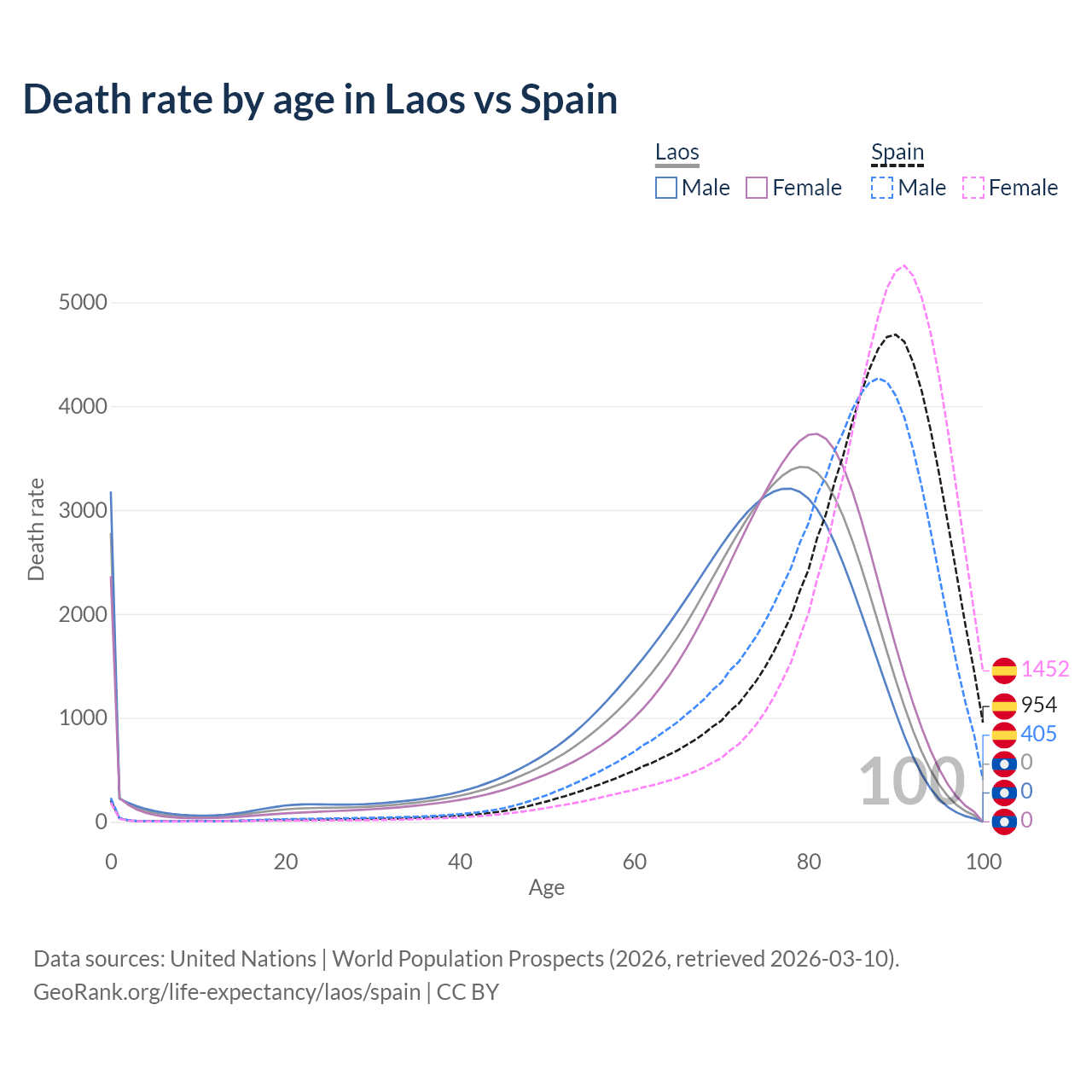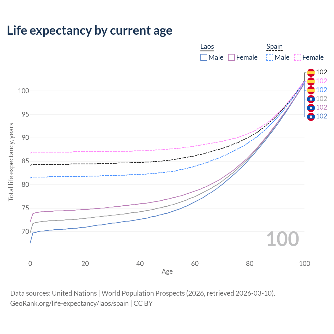 This life expectancy calculator shows the odds of living to 100, 95, 90, and below based on current age for both males and females in Laos and Spain, along with mean and median age of death. The calculations are based on the 2026 life tables (actuarial tables) from the UN World Population Prospects.