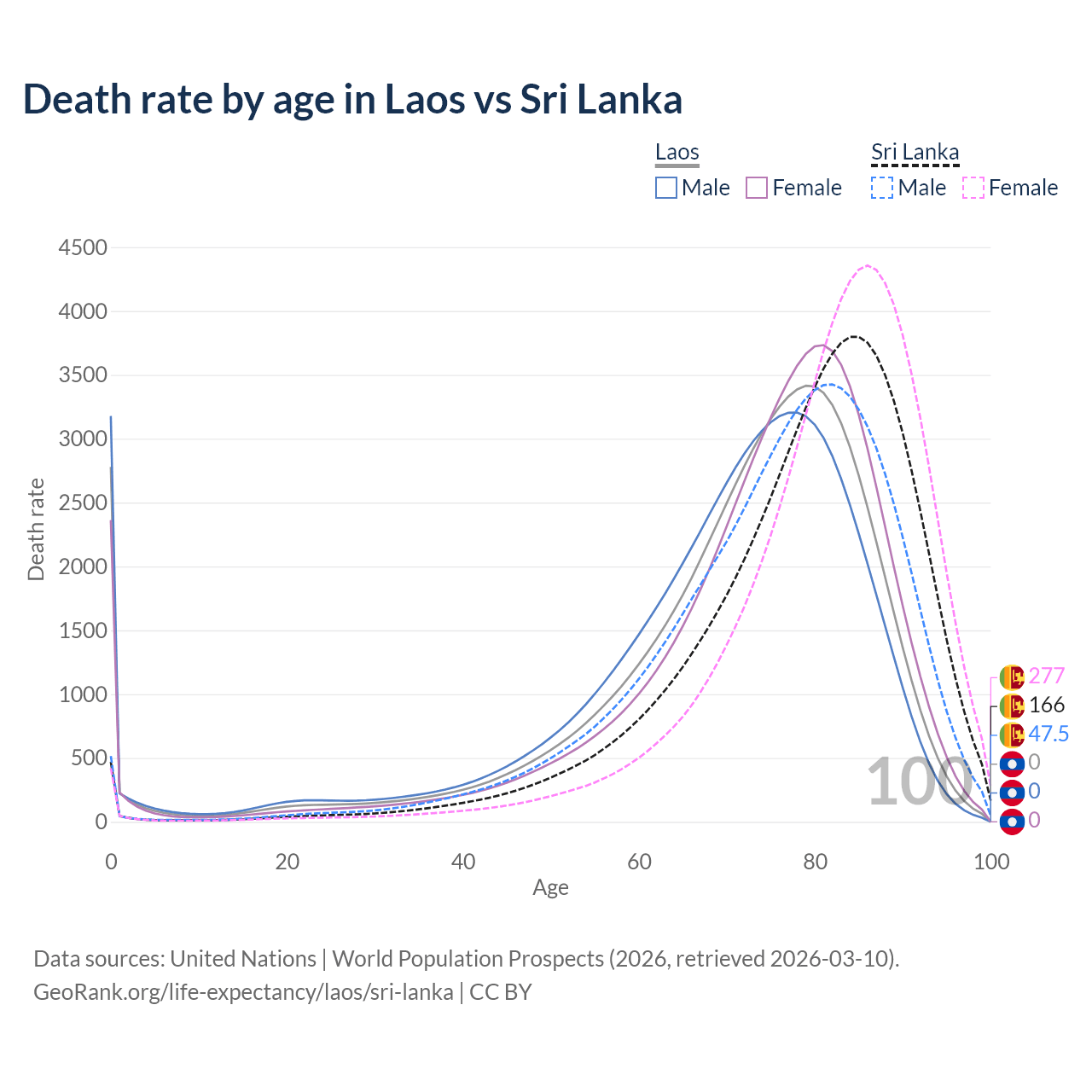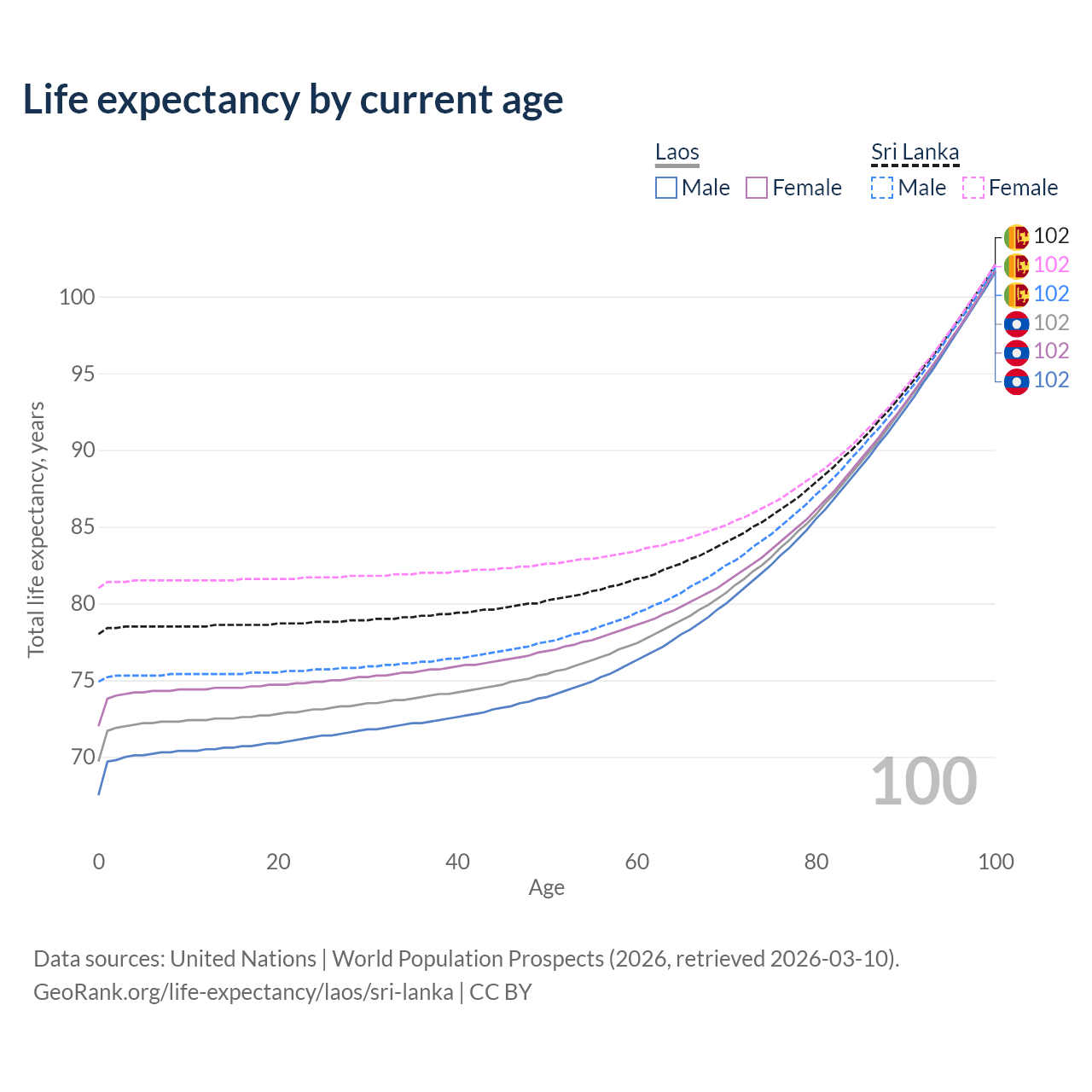 This life expectancy calculator shows the odds of living to 100, 95, 90, and below based on current age for both males and females in Laos and Sri Lanka, along with mean and median age of death. The calculations are based on the 2026 life tables (actuarial tables) from the UN World Population Prospects.