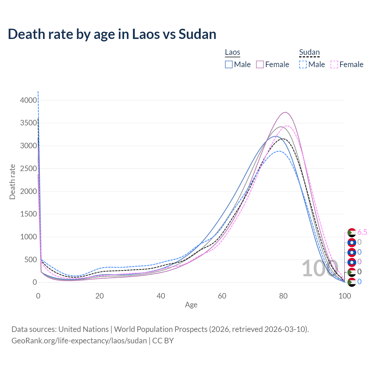 In Laos, the most common age of death is 79, compared to 0 in Sudan. The median age of death is 74.7 in Laos and 74.1 in Sudan, meaning only half of each cohort is expected to live past that age.