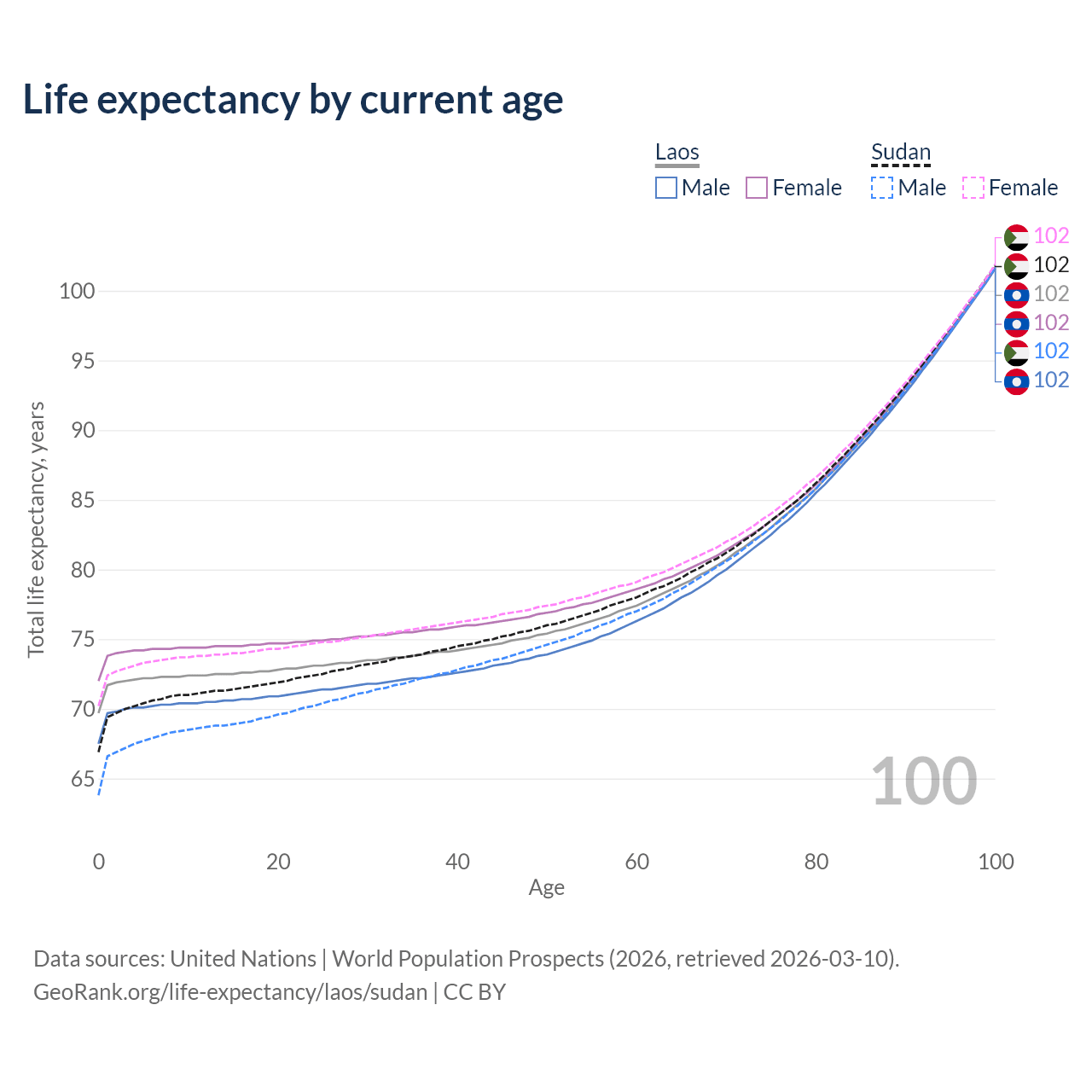 This life expectancy calculator shows the odds of living to 100, 95, 90, and below based on current age for both males and females in Laos and Sudan, along with mean and median age of death. The calculations are based on the 2026 life tables (actuarial tables) from the UN World Population Prospects.