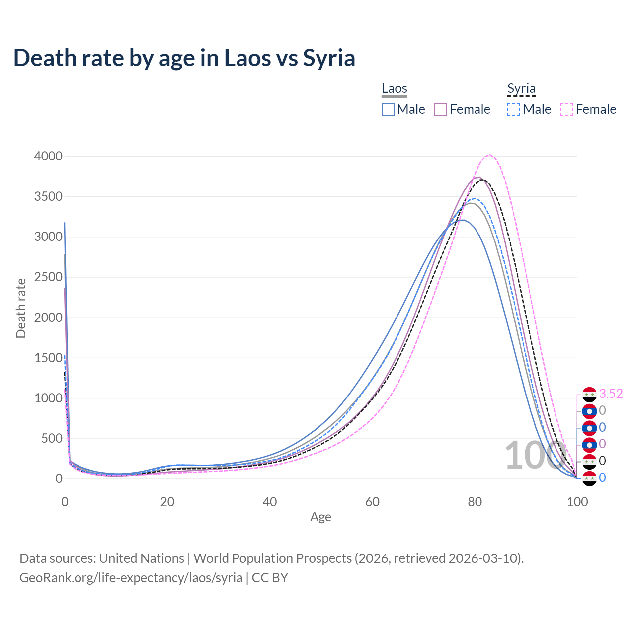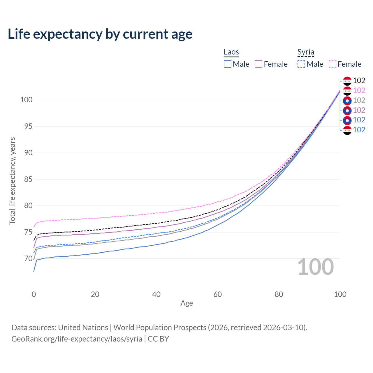 This life expectancy calculator shows the odds of living to 100, 95, 90, and below based on current age for both males and females in Laos and Syria, along with mean and median age of death. The calculations are based on the 2026 life tables (actuarial tables) from the UN World Population Prospects.