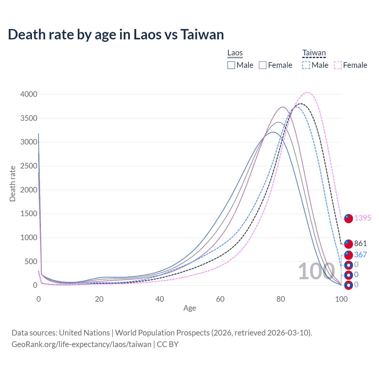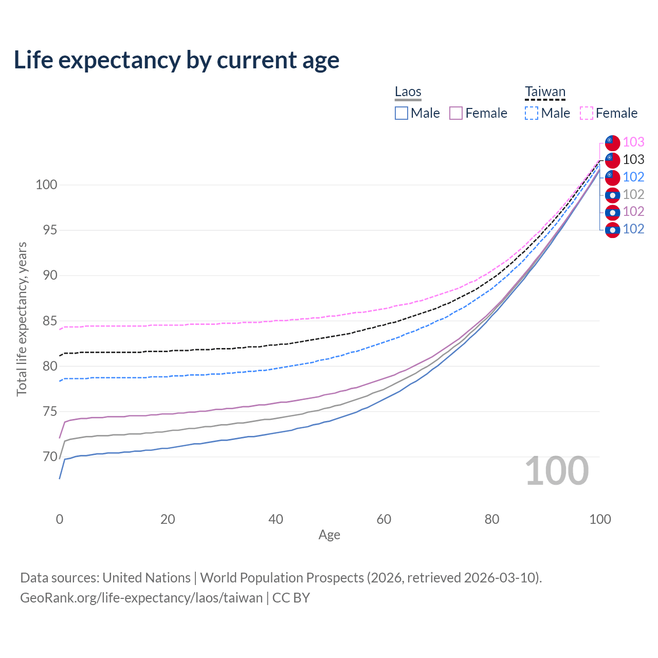 This life expectancy calculator shows the odds of living to 100, 95, 90, and below based on current age for both males and females in Laos and Taiwan, along with mean and median age of death. The calculations are based on the 2026 life tables (actuarial tables) from the UN World Population Prospects.