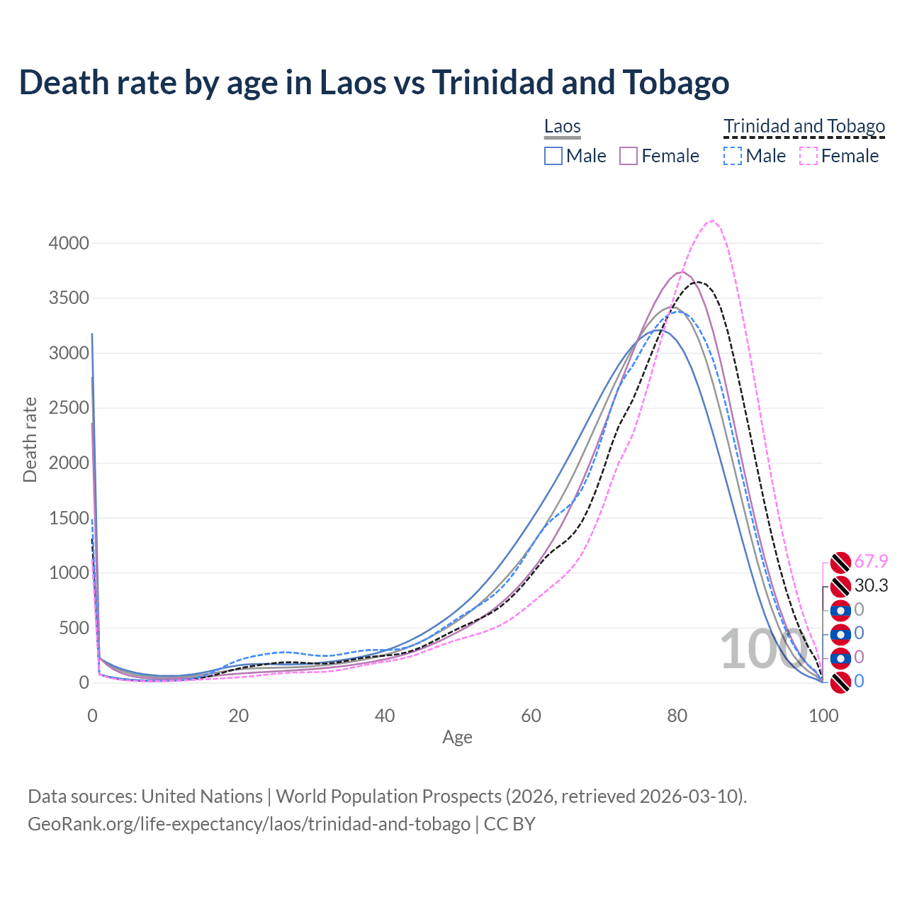 In Laos, the most common age of death is 79, compared to 83 in Trinidad and Tobago. The median age of death is 74.7 in Laos and 78.4 in Trinidad and Tobago, meaning only half of each cohort is expected to live past that age.
