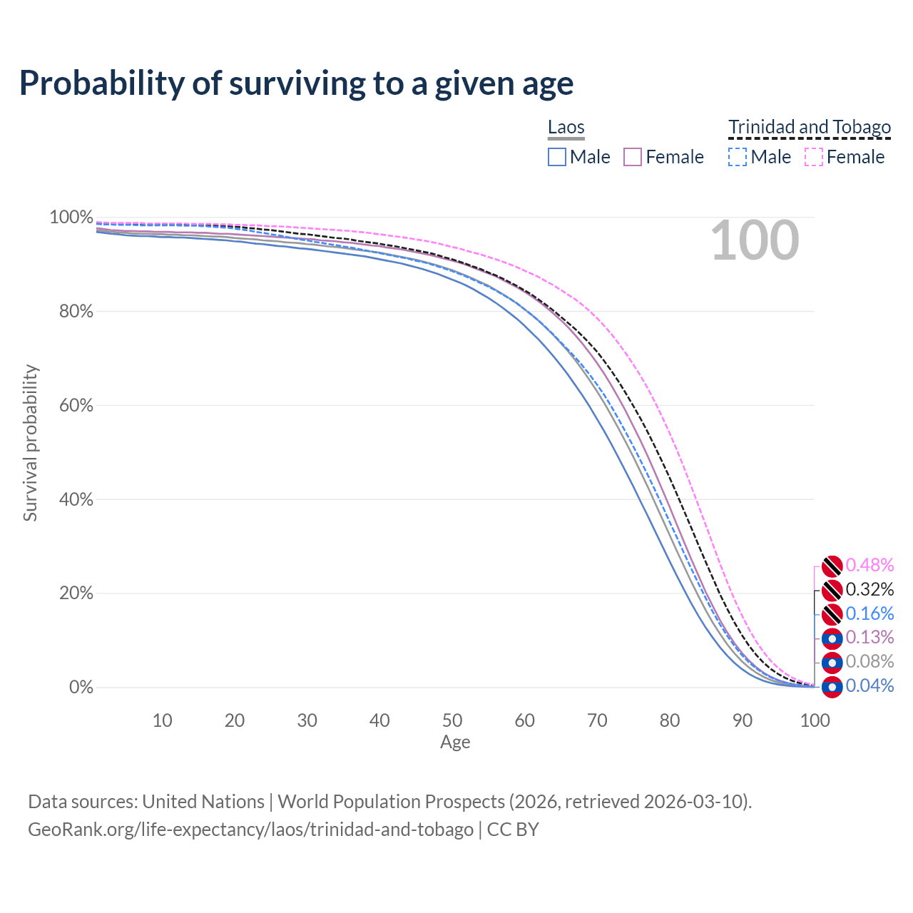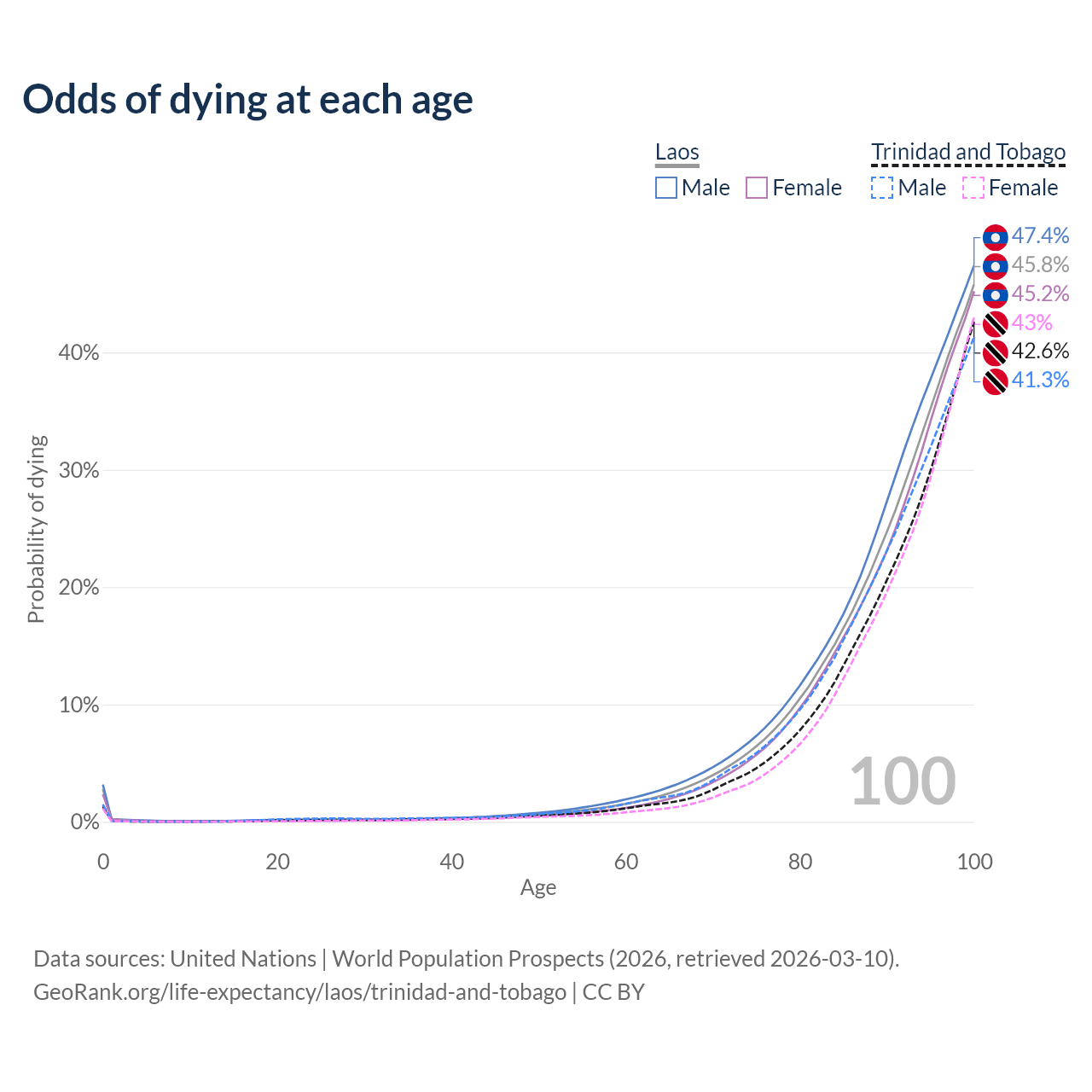 This life expectancy calculator shows the odds of living to 100, 95, 90, and below based on current age for both males and females in Laos and Trinidad and Tobago, along with mean and median age of death. The calculations are based on the 2026 life tables (actuarial tables) from the UN World Population Prospects.