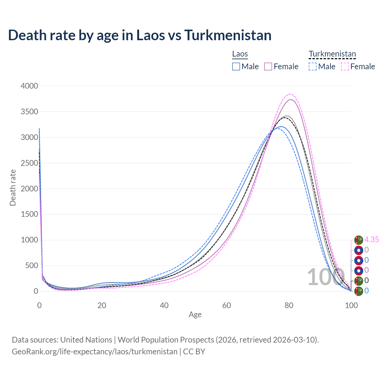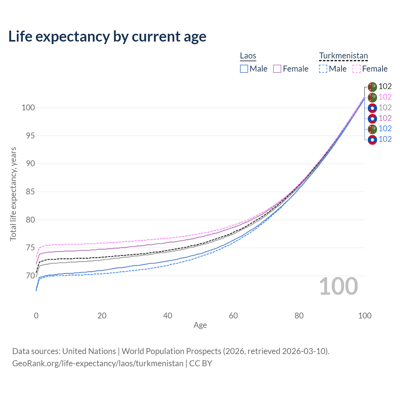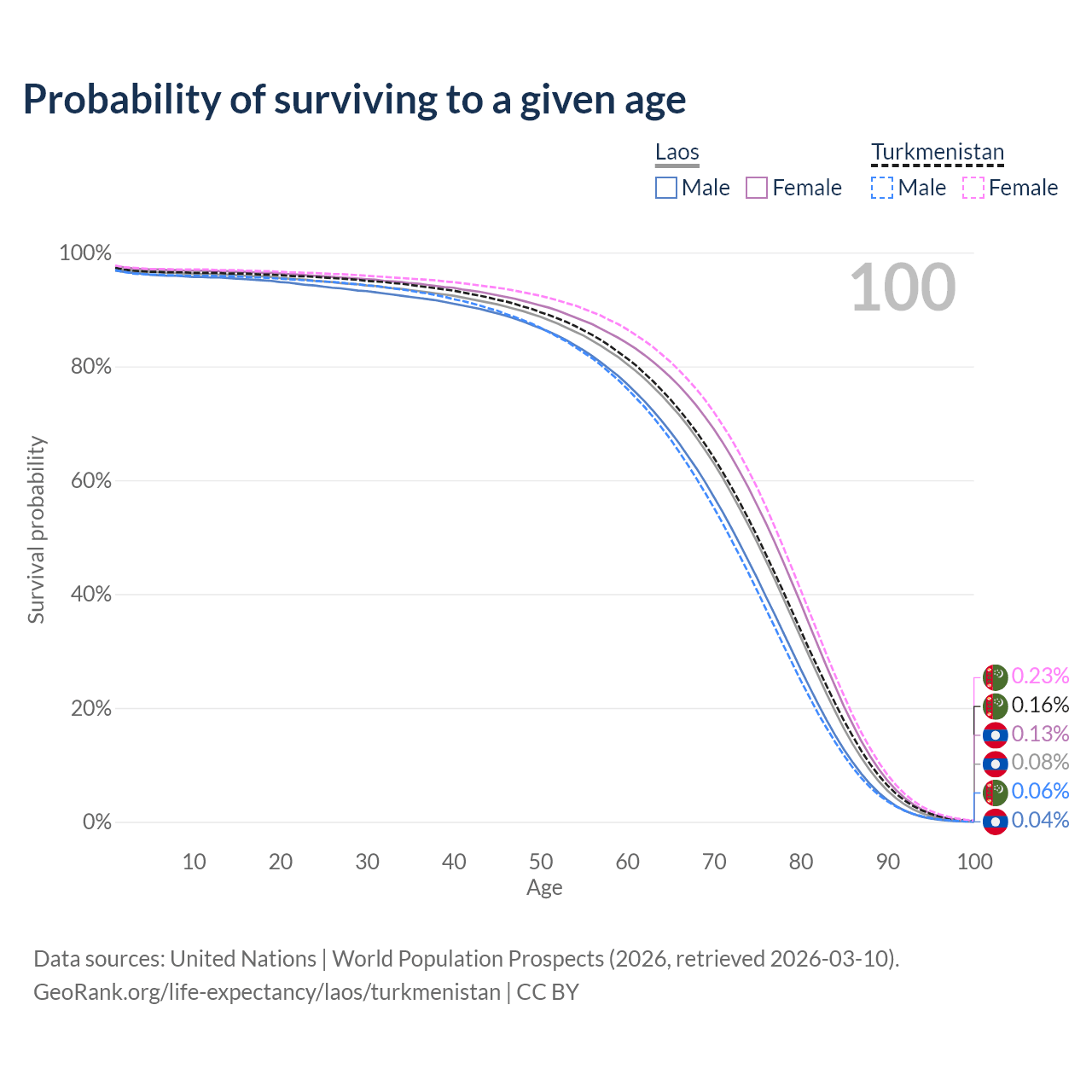 This life expectancy calculator shows the odds of living to 100, 95, 90, and below based on current age for both males and females in Laos and Turkmenistan, along with mean and median age of death. The calculations are based on the 2026 life tables (actuarial tables) from the UN World Population Prospects.