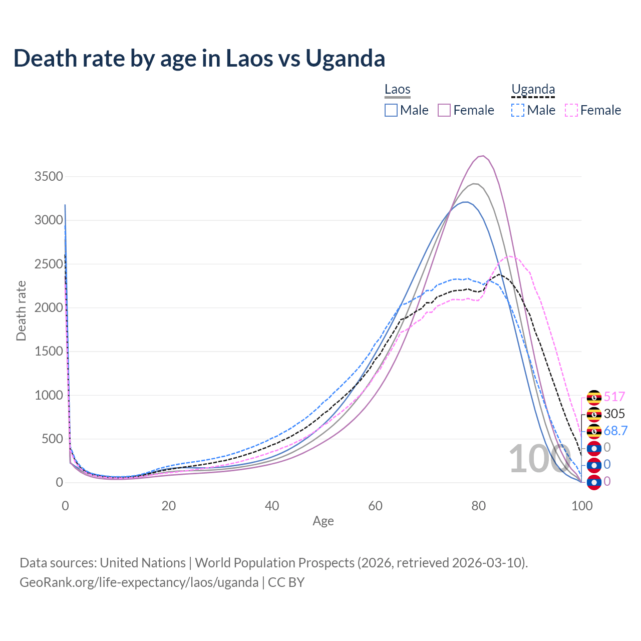In Laos, the most common age of death is 79, compared to 0 in Uganda. The median age of death is 74.7 in Laos and 73.3 in Uganda, meaning only half of each cohort is expected to live past that age.