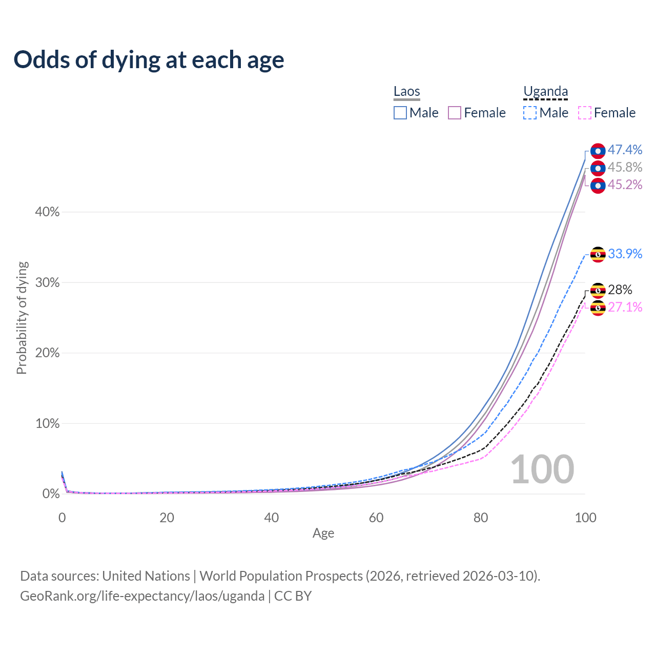 This life expectancy calculator shows the odds of living to 100, 95, 90, and below based on current age for both males and females in Laos and Uganda, along with mean and median age of death. The calculations are based on the 2026 life tables (actuarial tables) from the UN World Population Prospects.