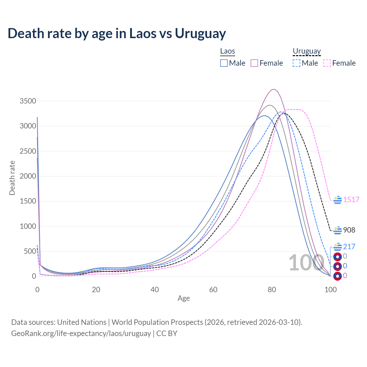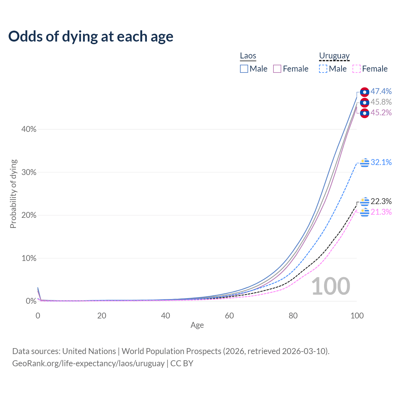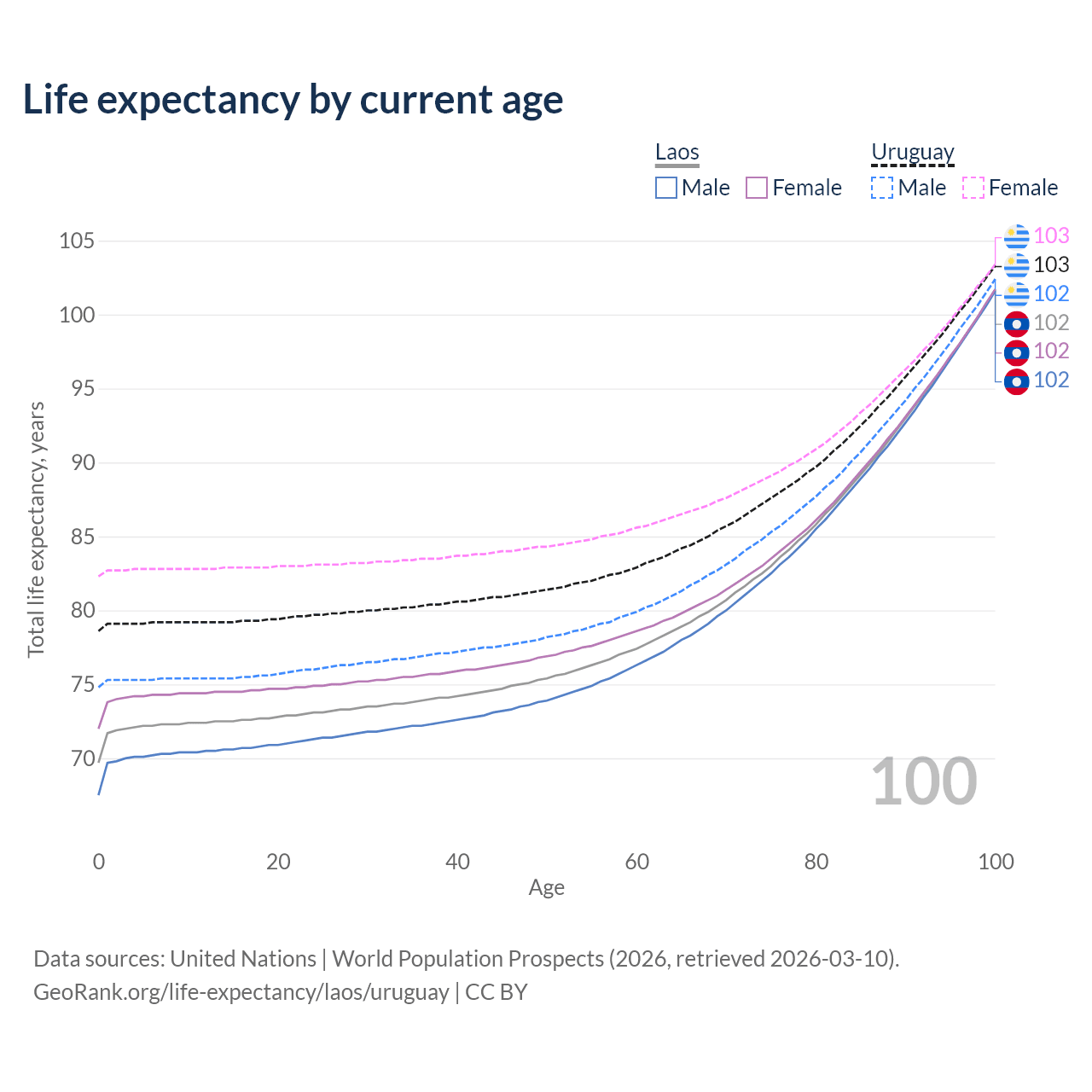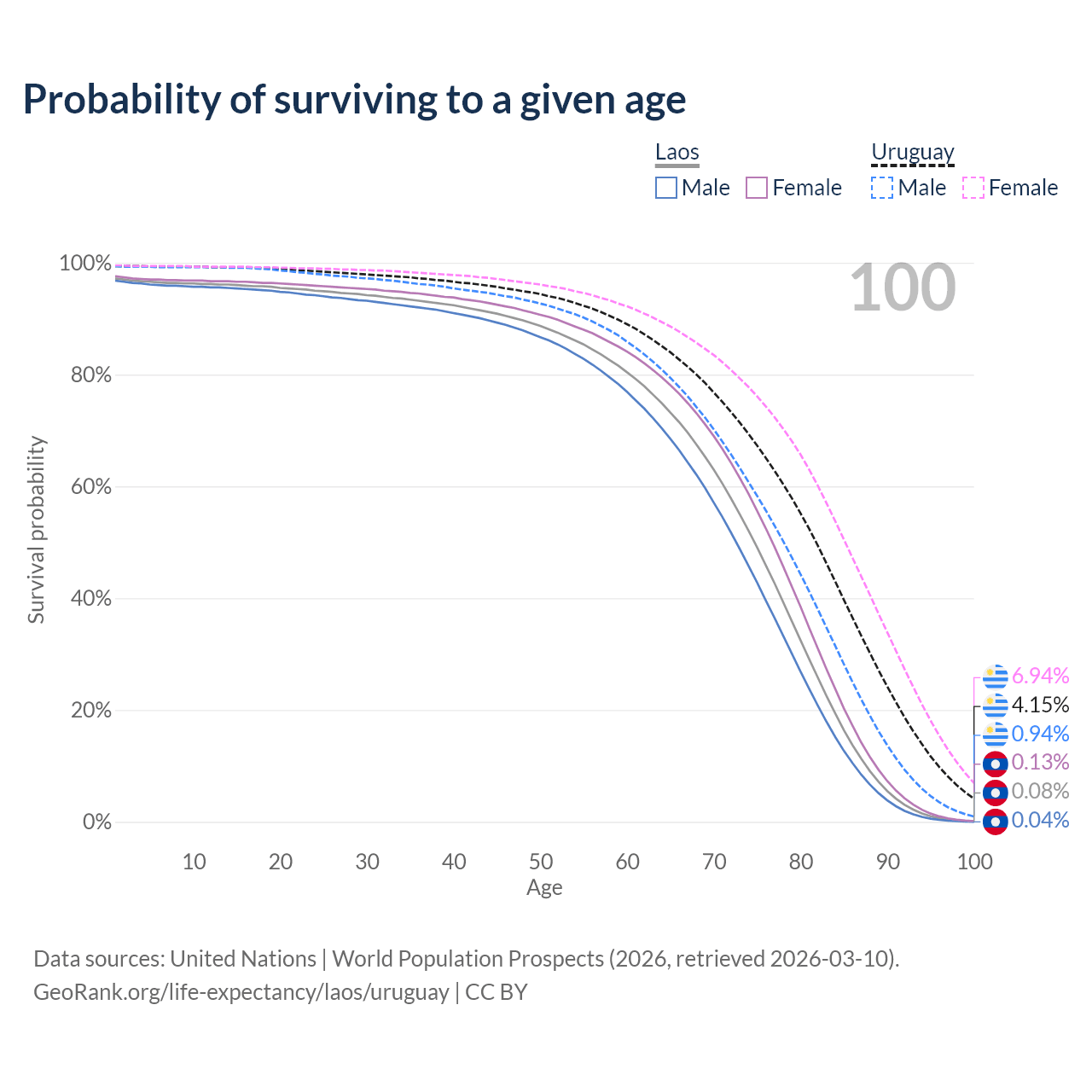 This life expectancy calculator shows the odds of living to 100, 95, 90, and below based on current age for both males and females in Laos and Uruguay, along with mean and median age of death. The calculations are based on the 2026 life tables (actuarial tables) from the UN World Population Prospects.
