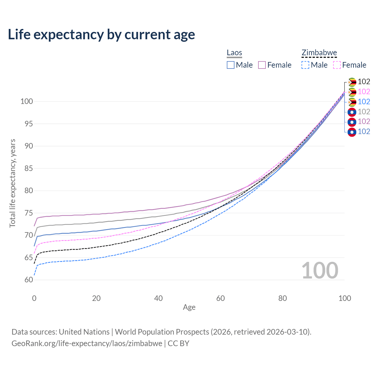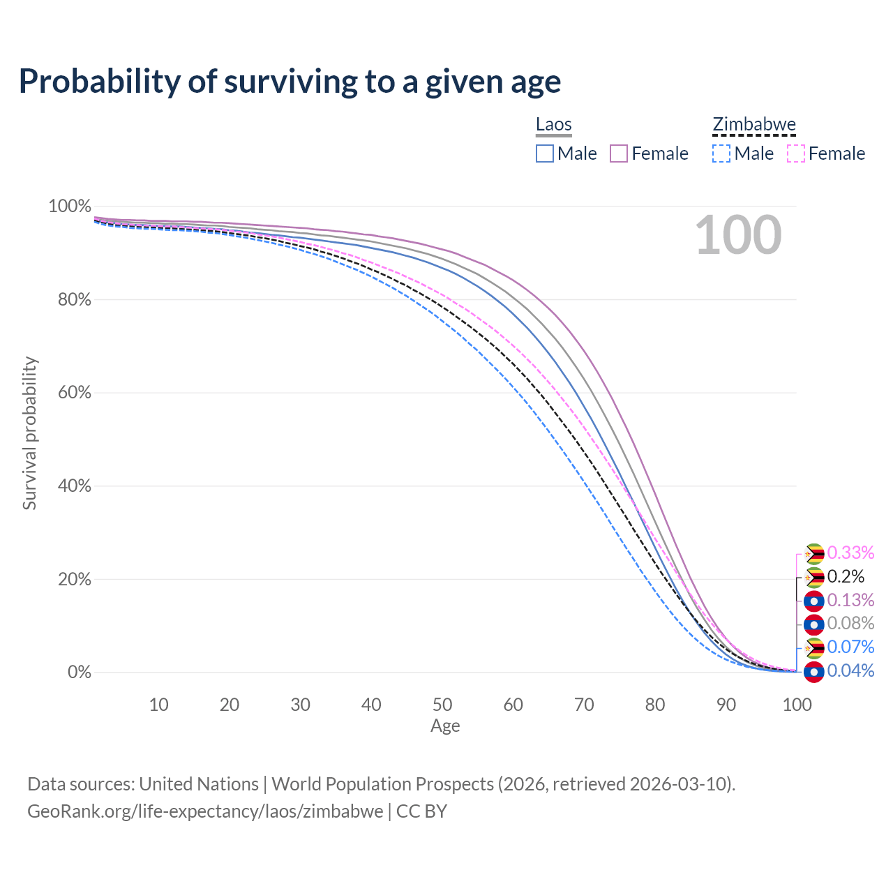 This life expectancy calculator shows the odds of living to 100, 95, 90, and below based on current age for both males and females in Laos and Zimbabwe, along with mean and median age of death. The calculations are based on the 2026 life tables (actuarial tables) from the UN World Population Prospects.