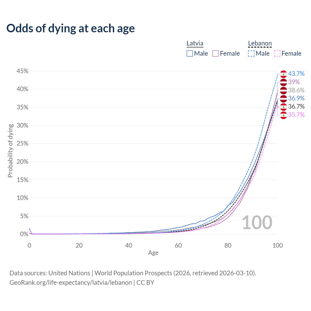 This life expectancy calculator shows the odds of living to 100, 95, 90, and below based on current age for both males and females in Latvia and Lebanon, along with mean and median age of death. The calculations are based on the 2026 life tables (actuarial tables) from the UN World Population Prospects.