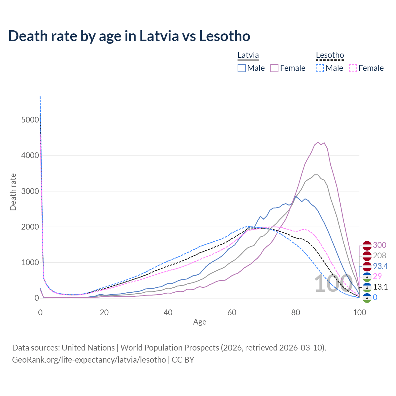 In Latvia, the most common age of death is 87, compared to 0 in Lesotho. The median age of death is 80.4 in Latvia and 63.4 in Lesotho, meaning only half of each cohort is expected to live past that age.