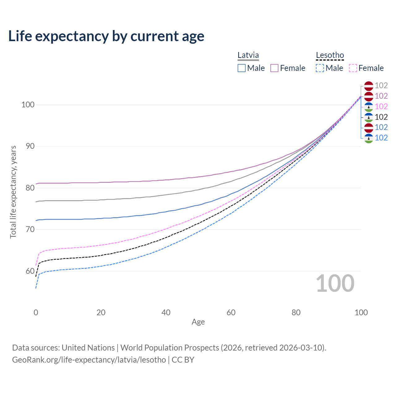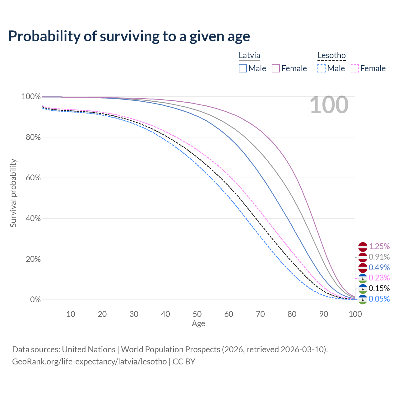 This life expectancy calculator shows the odds of living to 100, 95, 90, and below based on current age for both males and females in Latvia and Lesotho, along with mean and median age of death. The calculations are based on the 2026 life tables (actuarial tables) from the UN World Population Prospects.