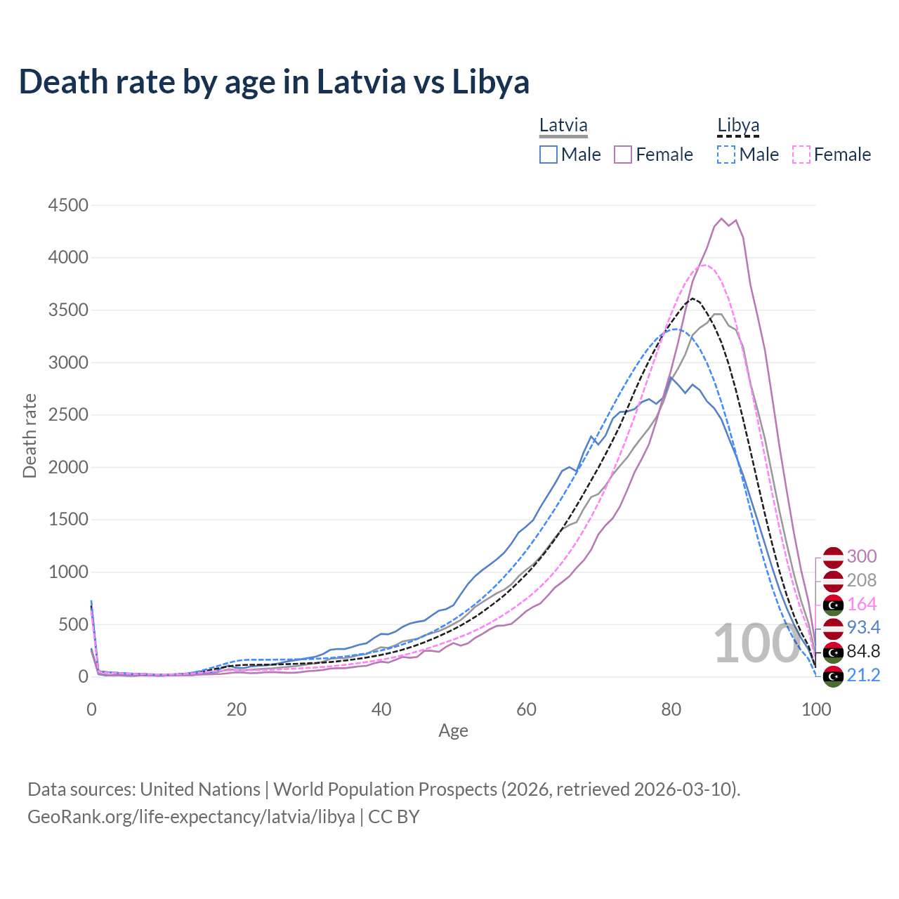 In Latvia, the most common age of death is 87, compared to 83 in Libya. The median age of death is 80.4 in Latvia and 78.8 in Libya, meaning only half of each cohort is expected to live past that age.
