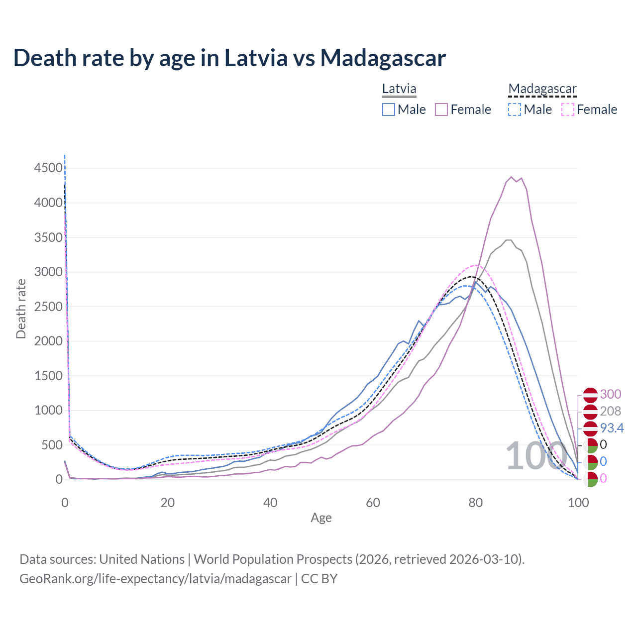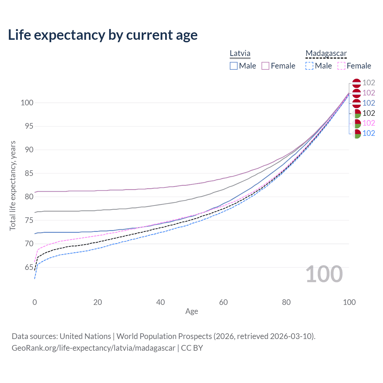 This life expectancy calculator shows the odds of living to 100, 95, 90, and below based on current age for both males and females in Latvia and Madagascar, along with mean and median age of death. The calculations are based on the 2026 life tables (actuarial tables) from the UN World Population Prospects.