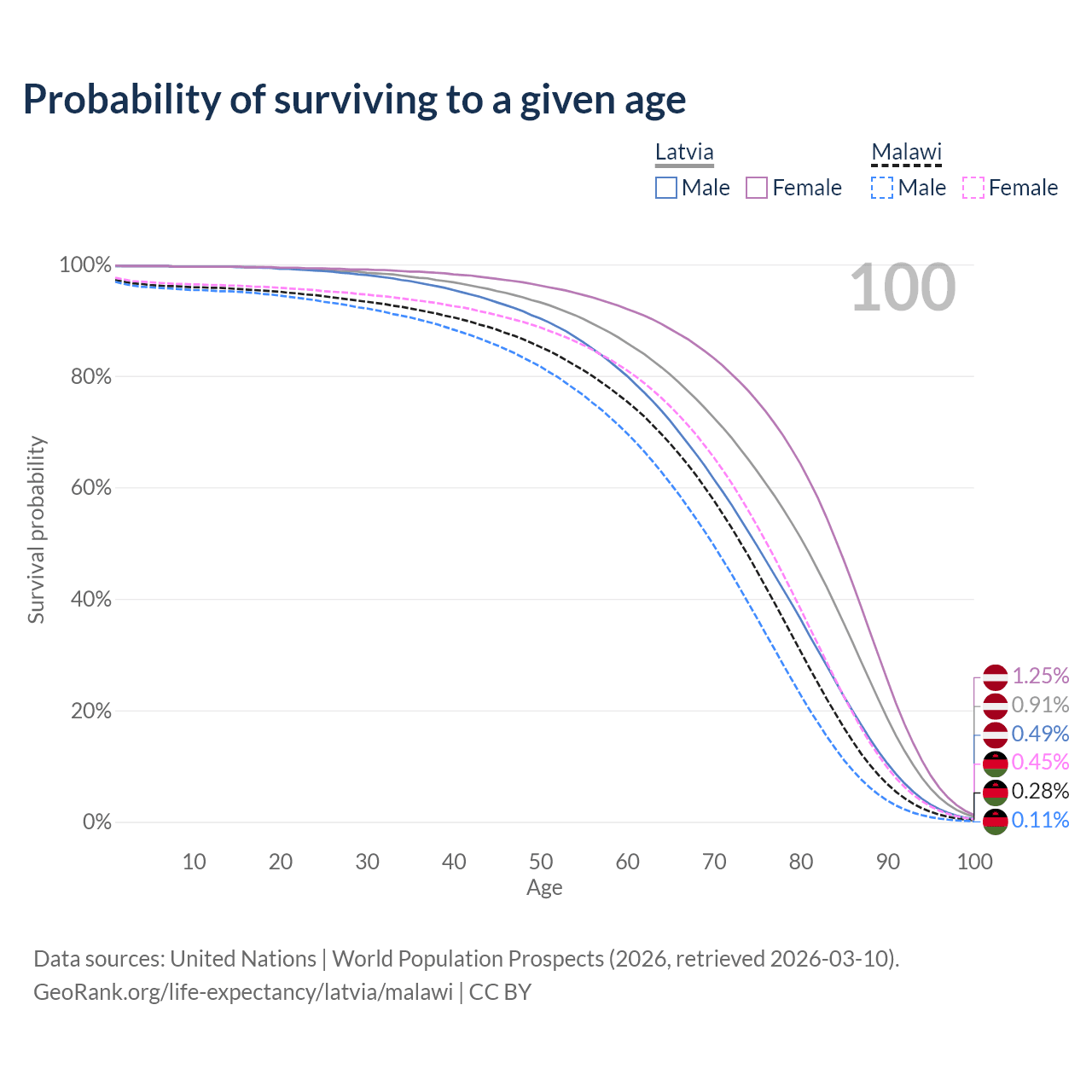 This life expectancy calculator shows the odds of living to 100, 95, 90, and below based on current age for both males and females in Latvia and Malawi, along with mean and median age of death. The calculations are based on the 2026 life tables (actuarial tables) from the UN World Population Prospects.