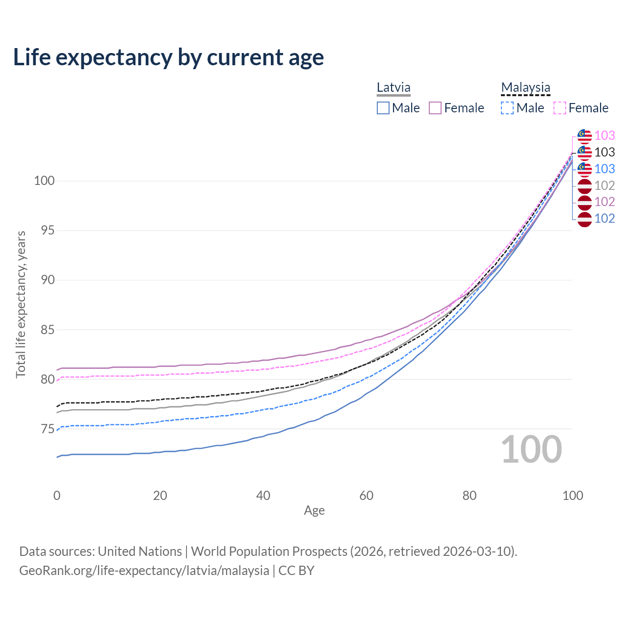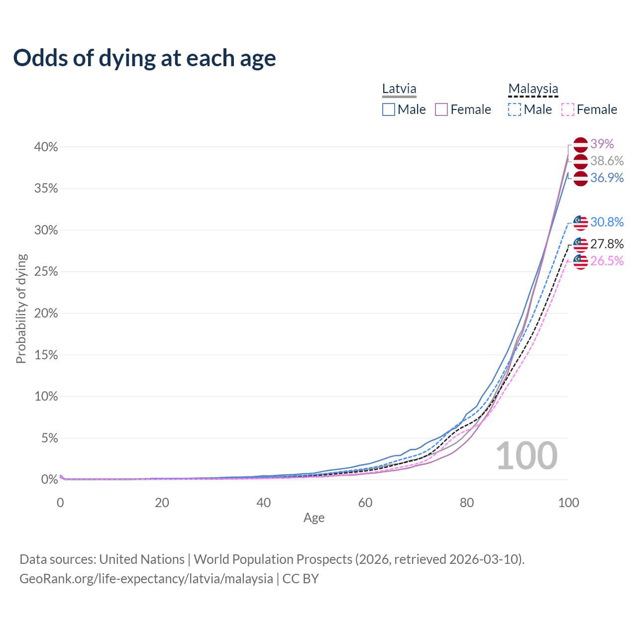 This life expectancy calculator shows the odds of living to 100, 95, 90, and below based on current age for both males and females in Latvia and Malaysia, along with mean and median age of death. The calculations are based on the 2026 life tables (actuarial tables) from the UN World Population Prospects.