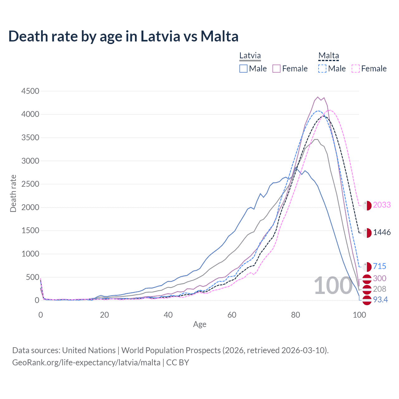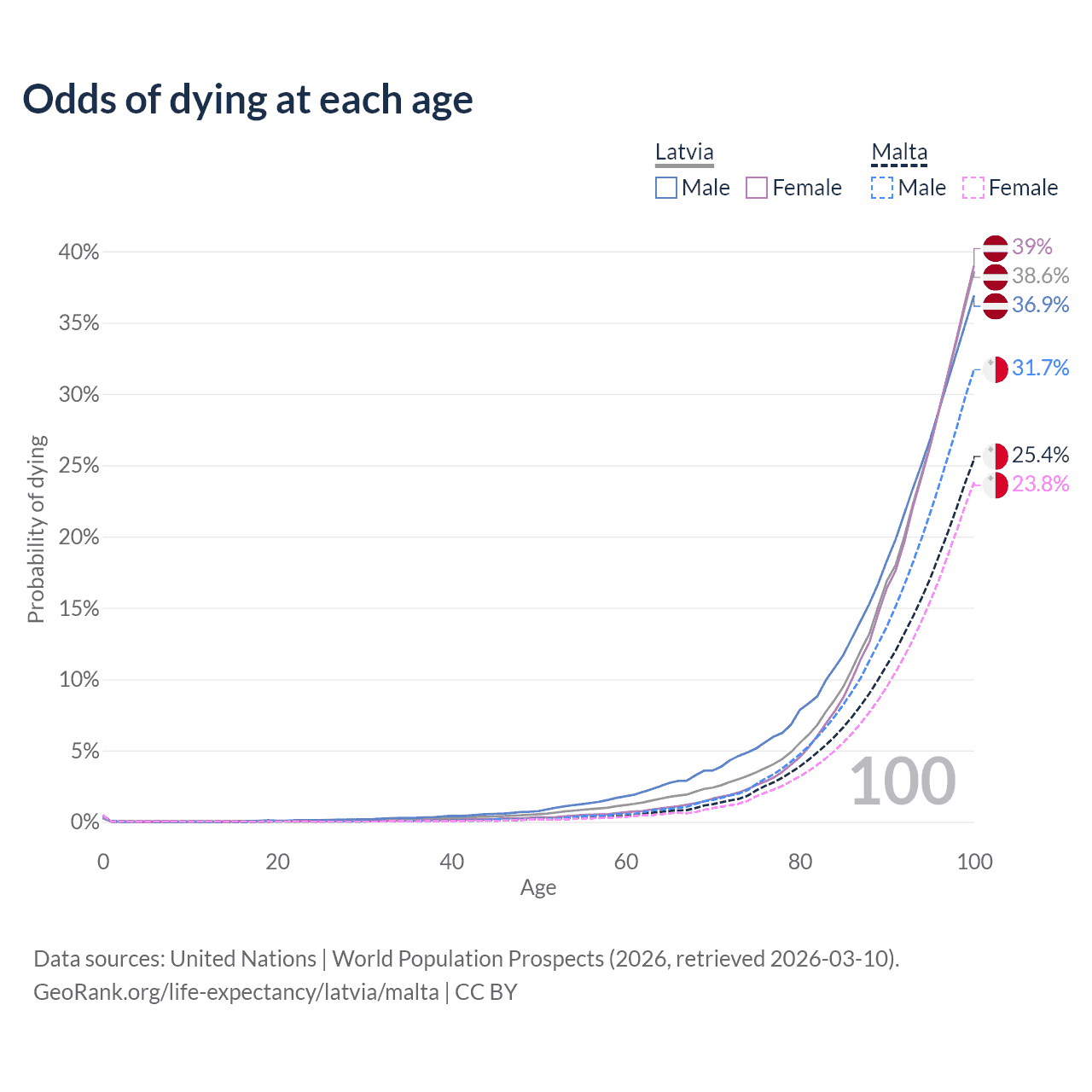This life expectancy calculator shows the odds of living to 100, 95, 90, and below based on current age for both males and females in Latvia and Malta, along with mean and median age of death. The calculations are based on the 2026 life tables (actuarial tables) from the UN World Population Prospects.
