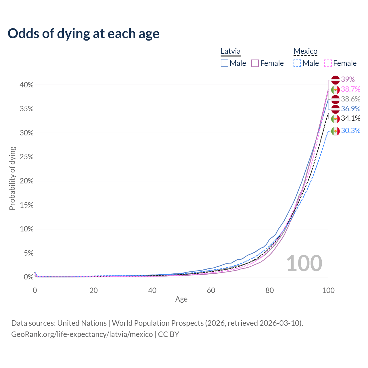 This life expectancy calculator shows the odds of living to 100, 95, 90, and below based on current age for both males and females in Latvia and Mexico, along with mean and median age of death. The calculations are based on the 2026 life tables (actuarial tables) from the UN World Population Prospects.