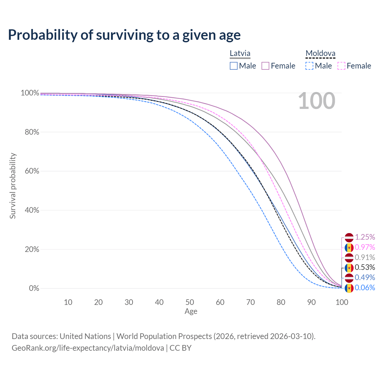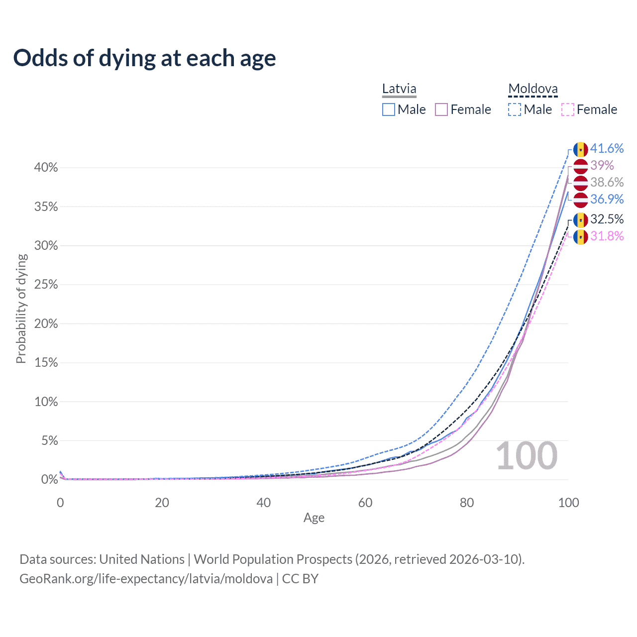 This life expectancy calculator shows the odds of living to 100, 95, 90, and below based on current age for both males and females in Latvia and Moldova, along with mean and median age of death. The calculations are based on the 2026 life tables (actuarial tables) from the UN World Population Prospects.