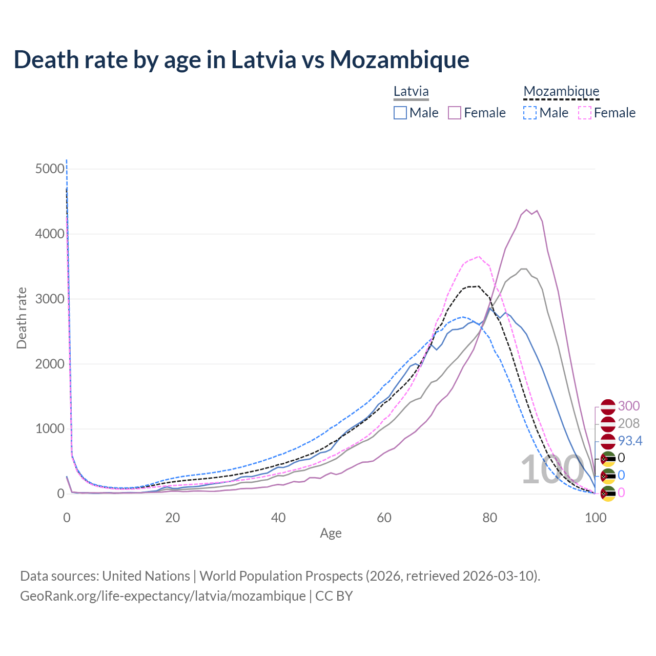 In Latvia, the most common age of death is 87, compared to 0 in Mozambique. The median age of death is 80.4 in Latvia and 71.2 in Mozambique, meaning only half of each cohort is expected to live past that age.