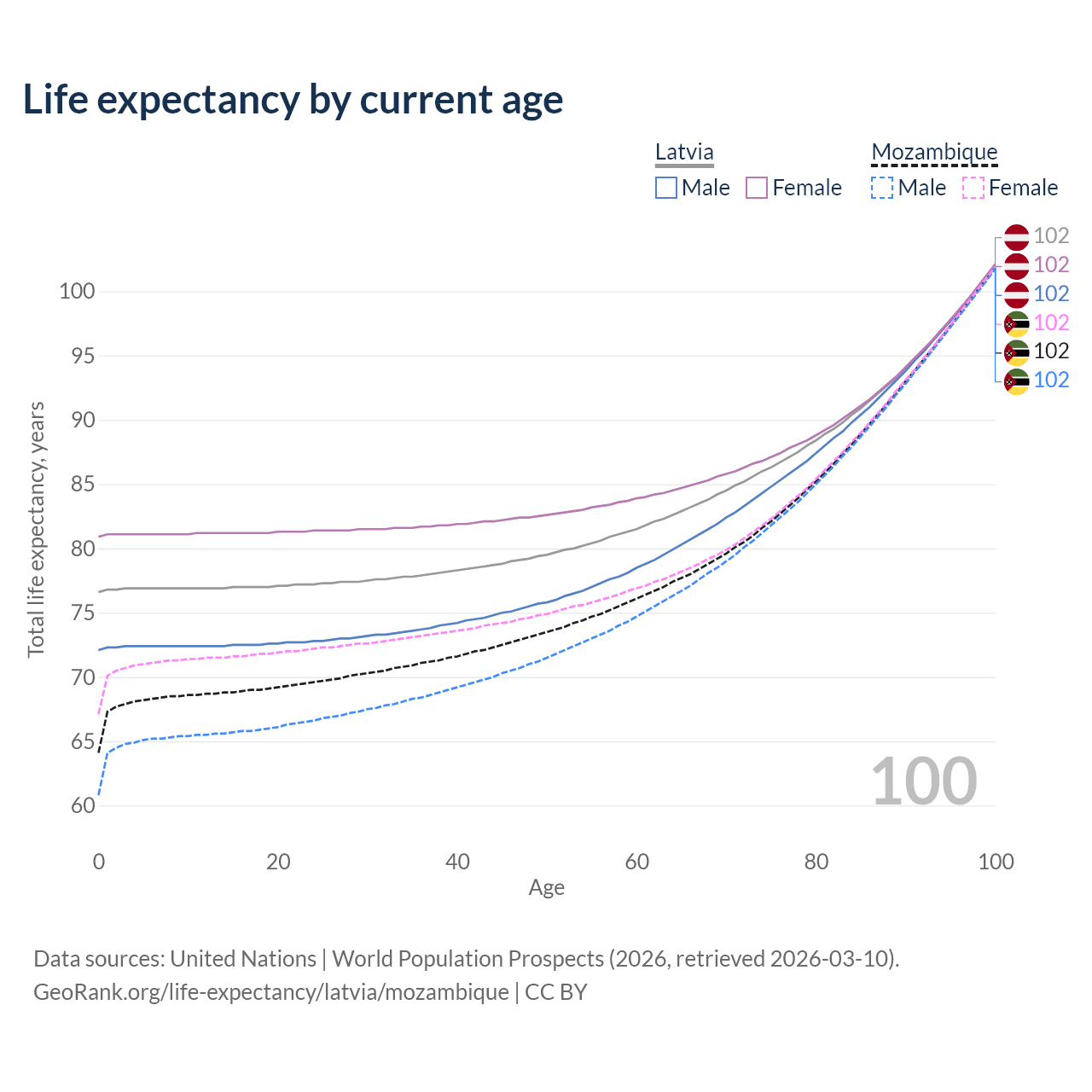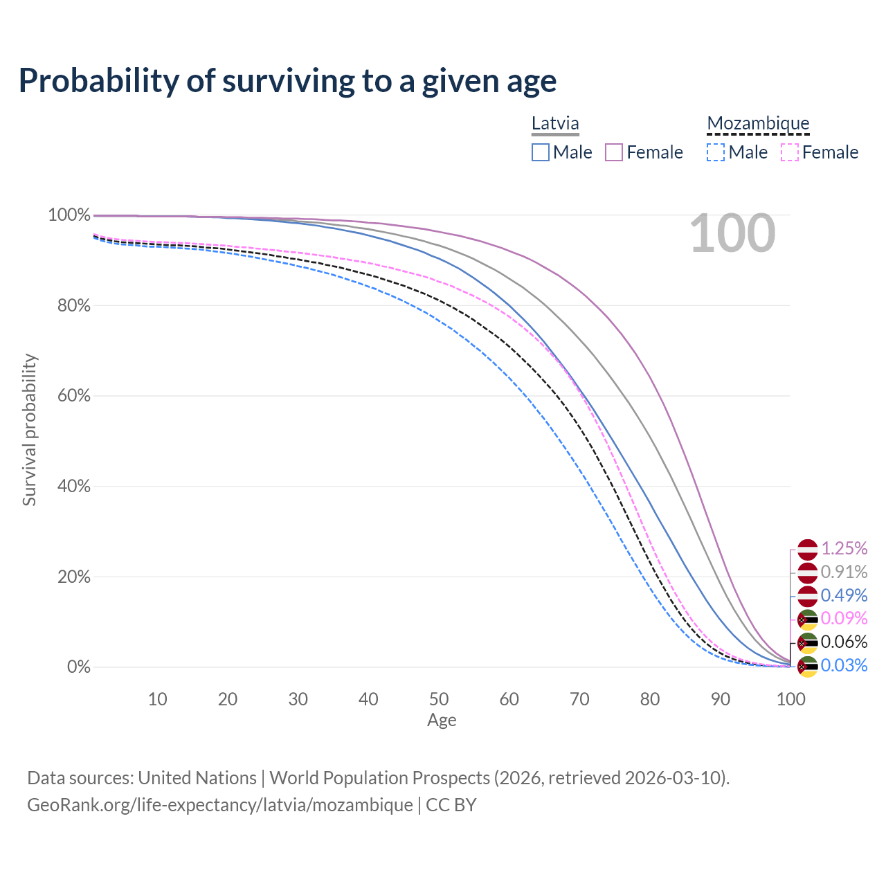 This life expectancy calculator shows the odds of living to 100, 95, 90, and below based on current age for both males and females in Latvia and Mozambique, along with mean and median age of death. The calculations are based on the 2026 life tables (actuarial tables) from the UN World Population Prospects.