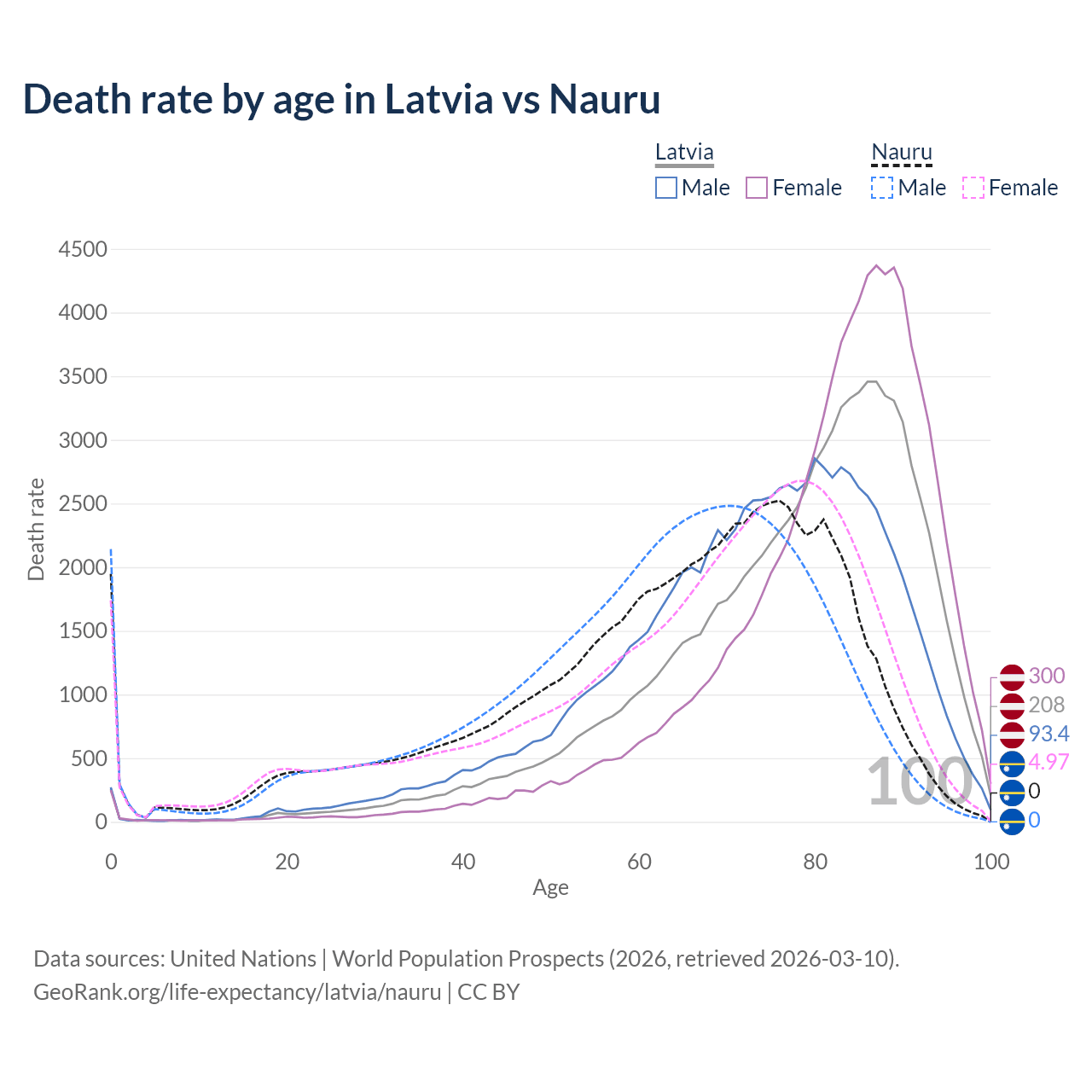 In Latvia, the most common age of death is 87, compared to 76 in Nauru. The median age of death is 80.4 in Latvia and 67.3 in Nauru, meaning only half of each cohort is expected to live past that age.