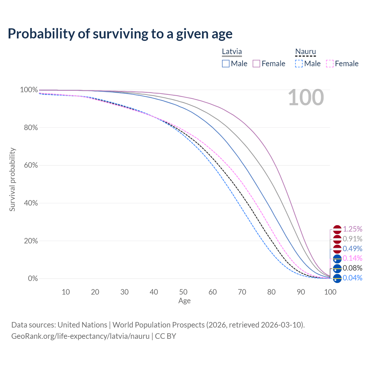 This life expectancy calculator shows the odds of living to 100, 95, 90, and below based on current age for both males and females in Latvia and Nauru, along with mean and median age of death. The calculations are based on the 2026 life tables (actuarial tables) from the UN World Population Prospects.