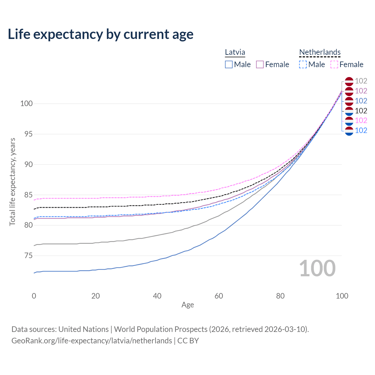 This life expectancy calculator shows the odds of living to 100, 95, 90, and below based on current age for both males and females in Latvia and the Netherlands, along with mean and median age of death. The calculations are based on the 2026 life tables (actuarial tables) from the UN World Population Prospects.