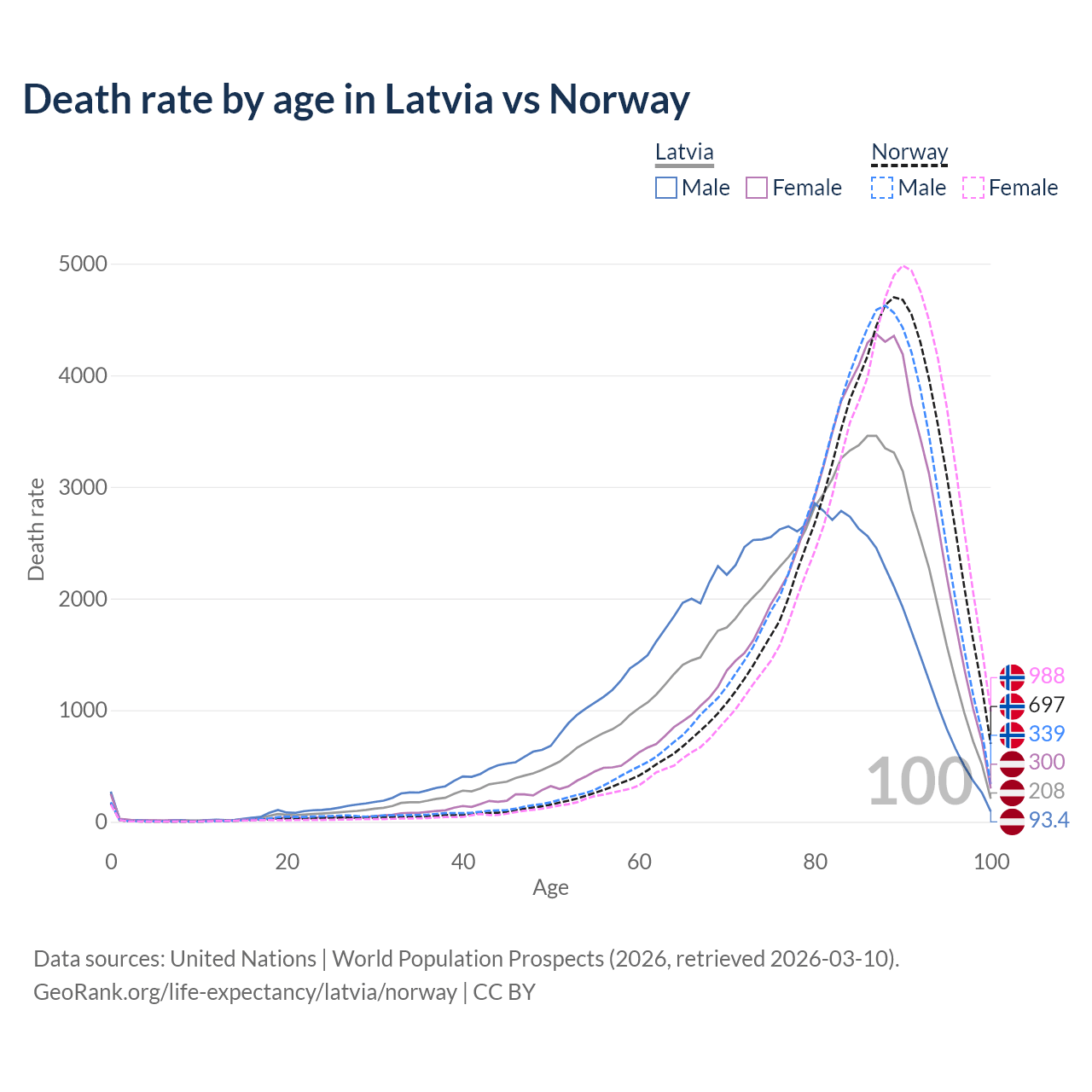 In Latvia, the most common age of death is 87, compared to 89 in Norway. The median age of death is 80.4 in Latvia and 86.5 in Norway, meaning only half of each cohort is expected to live past that age.