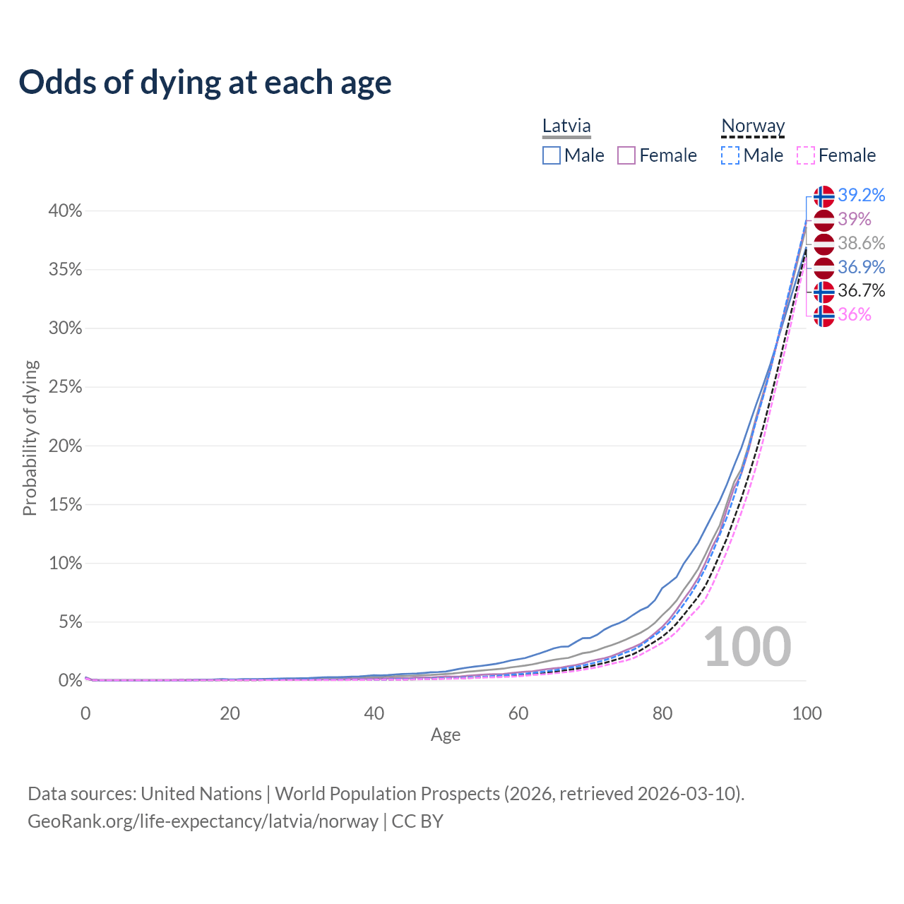 This life expectancy calculator shows the odds of living to 100, 95, 90, and below based on current age for both males and females in Latvia and Norway, along with mean and median age of death. The calculations are based on the 2026 life tables (actuarial tables) from the UN World Population Prospects.